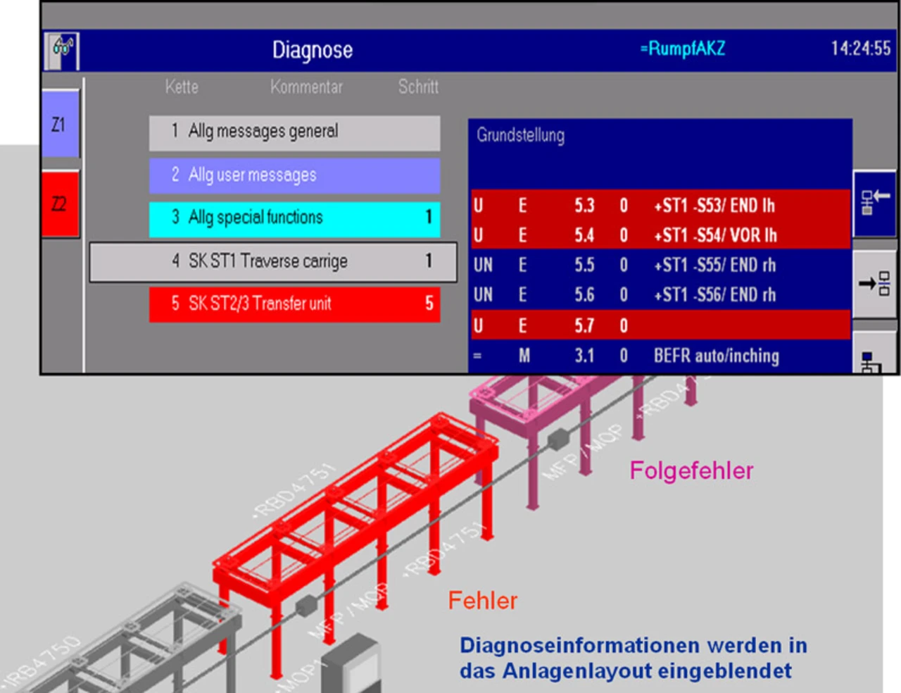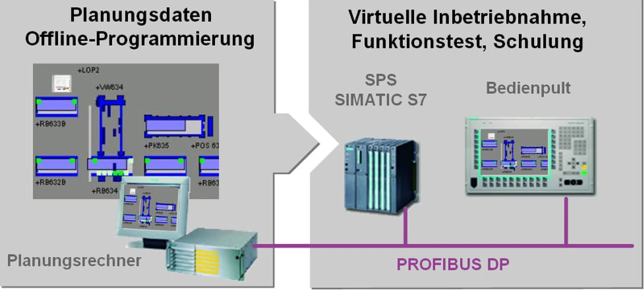Der nächste Schritt im Engineering-Prozess ist die virtuelle Inbetriebsetzung. Das virtuelle Anlagenmodell, das bereits in der layout-basierten Anlagenprojektierung verwendet wurde, wird von der realen Automatisierungstechnik (Software und Hardware) gesteuert. In dieser Phase agiert die virtuelle Welt sehr eng mit der projektierten Steuerungstechnik, ohne dass die reale Anlage aufgebaut sein muss. Der Anwender kann somit schon vor der eigentlichen Inbetriebnahme Fehler in der Anlagenkonfiguration erkennen und beseitigen. Dies sichert in einem sehr frühen Stadium die Projektierungsqualität und verkürzt die Inbetriebnahme der realen Anlage.