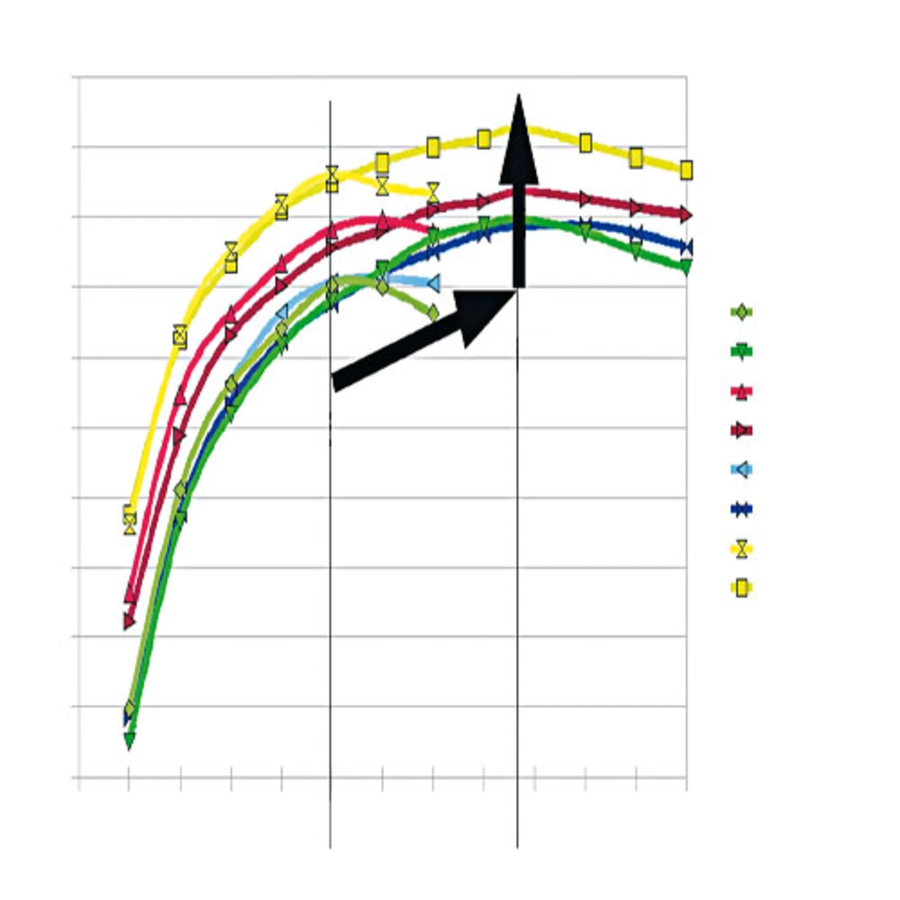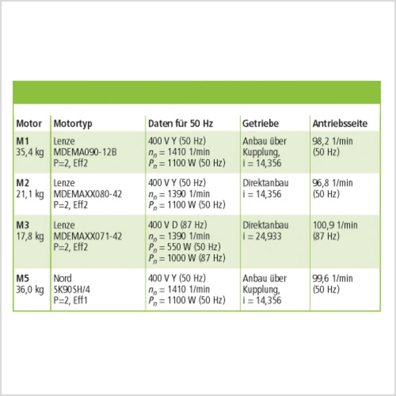 Durch Änderung der Getriebe-Übersetzung lässt sich die beim 87-Hz-System vorhandene höhere Motordrehzahl an die Abtriebsdrehzahl anpassen. Dies erfolgt ohne nennenswerte Veränderung des Wirkungsgrades, sofern die Zahl der Getriebestufen beibehalten werden kann. Da sich die Drehzahl des Motors um den Faktor 1,73 erhöht, kann für die gleiche mechanische Leistung das Drehmoment um den Faktor 1,73 geringer ausfallen. Konkret hat der Betrieb bei 87 Hz (Dreickschaltung) anstelle von 50 Hz (Sternschaltung) bei der Maschine M2 (Baugröße 80, Eff2) zu einer Verbesserung des Wirkungsgrades von 66 % auf 71 % geführt. Dieser Trend ist bei allen Asynchronmaschinen zu beobachten. Vergleicht man die getesteten Antriebe untereinander, so hat beispielsweise der Antrieb M1 (Baugröße 90, Eff2, 35,4 kg) bei 50 Hz einen schlechteren Wirkungsgrad von 63 % als M3 (Baugröße 71, Eff2, 17,8 kg), der bei 87 Hz einen Wirkungsgrad von 69 % aufweist. Ergo: Die 87-Hz- Technik führt zu einem leichteren, also materialsparenden Antrieb, der dennoch einen hohen Wirkungsgrad aufweist.