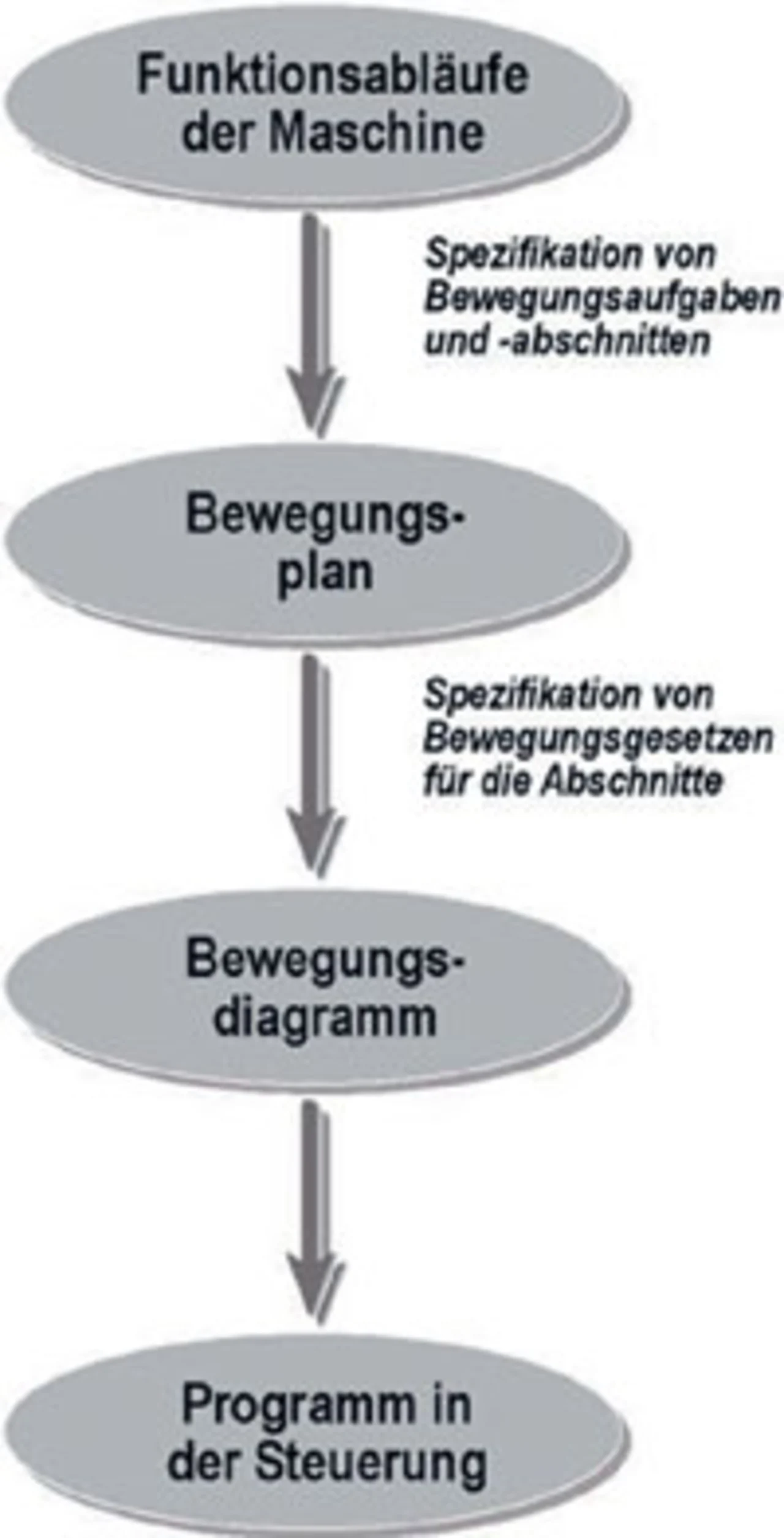 Das Beispiel zeigt eine Anwendung mit einer Füll- und einer Hubachse. Die Bewegung der Füllachse lässt sich in vier Abschnitte unterteilen. Im ersten Abschnitt ruht die Achse, es findet keine Bewegung statt. Im zweiten Abschnitt fährt die Achse in die Endstellung und im dritten wieder zur Ausgangsstellung zurück. Im vierten Abschnitt findet wiederum keine Bewegung statt. Die Hubachse ist durch drei Bewegungsabschnitte definiert. Sie bewegt sich während des Stillstandes der Füllachse und umgekehrt. Durch die Möglichkeit, mehrere Achsen untereinander darzustellen, ist auch ein optischer Bezug vorhanden. Aus dem Bewegungsplan ergibt sich durch das Einbeziehen von Bewegungsgesetzen das Bewegungsdiagramm. Bewegungsgesetze sind mathematische Funktionen, die festlegen, wie die vorgegebene Bewegungsaufgabe konkret umgesetzt werden soll.