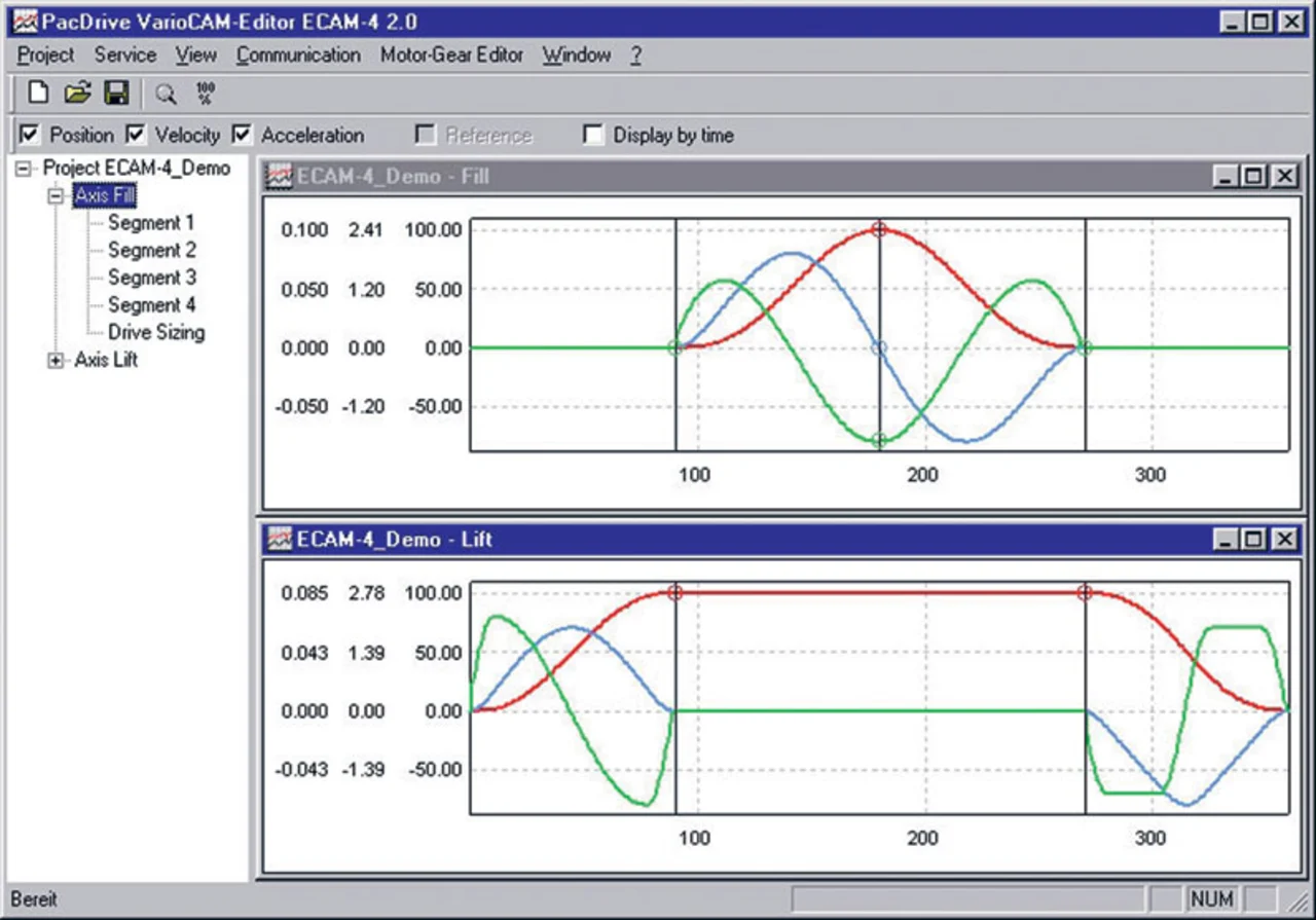 Für die Bewegungsprogrammierung sollte eine moderne Engineering-Umgebung dem Maschinenentwickler ein grafisches Werkzeug zur Verfügung stellen. In der Vergangen-heit musste der Anwender die Bewegungsfunktionen mit einem CAD- beziehungsweise Mathematik-Programm entwerfen und als Stützpunktdatei abspeichern. Anschließend war es notwendig, die Stützpunktdateien mit einem Spline-Algorithmus zu interpolieren. Über einen Bewegungseditor, wie er im Elau-Konzept realisiert wurde, ist es nun möglich, Bewegungskurven am Bildschirm grafisch und interaktiv zu erzeugen.