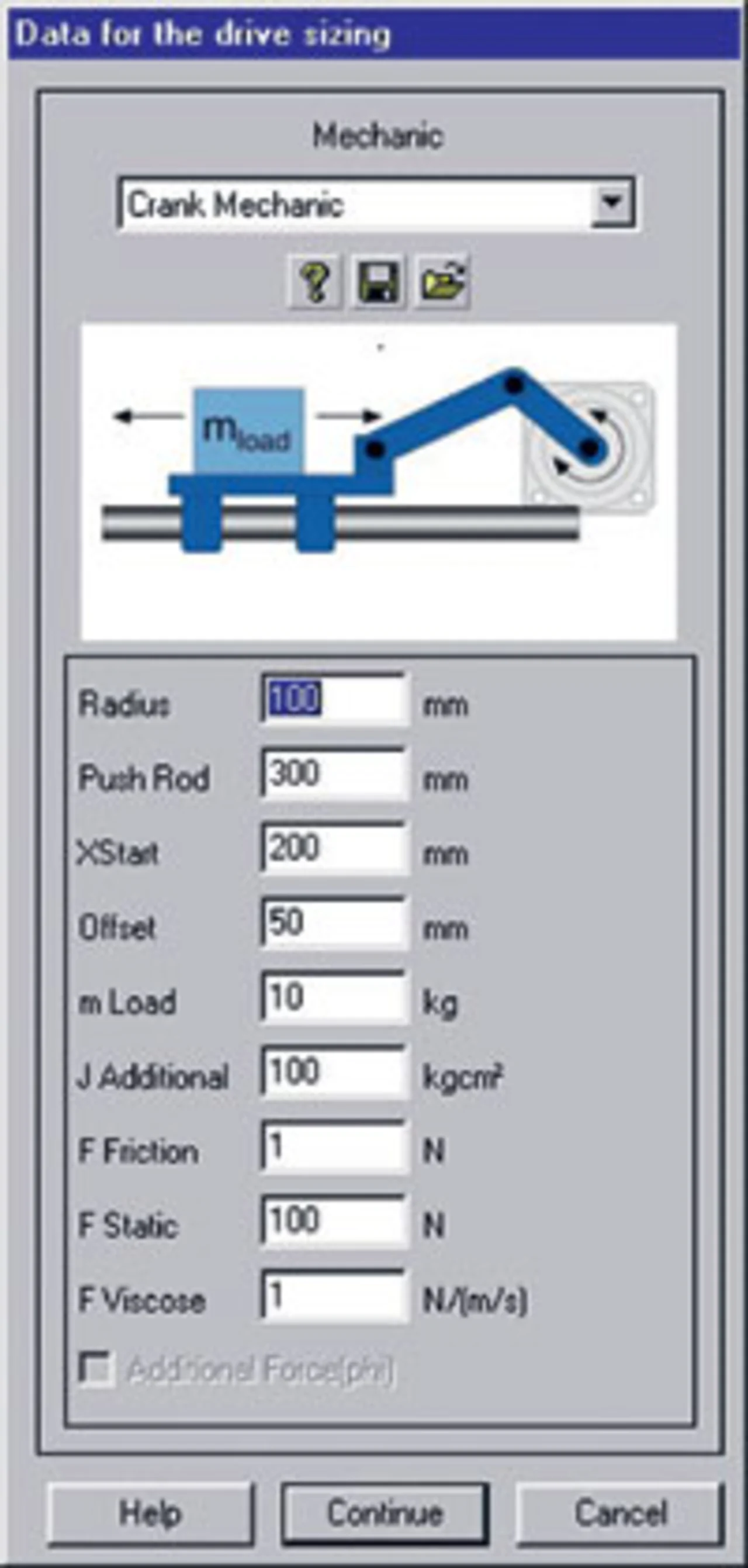Im ersten Schritt der softwaregestützten Antriebsauslegung wird die Mechanik beschrieben. Hier bietet das Engineering-Tool eine Auswahl von häufig im Verpackungsmaschinenbau verwendeten Lösungen an. Eine interessante Variante ist beispielsweise die Kurbelmechanik: Mit ihr lassen sich kostengünstig translatorische Bewegungen realisieren (Bild 3). Das Problem der Nichtlinearität löst hierbei das Software-Werkzeug für den Anwender. Das heißt: Für die Antriebsauslegung berechnet die Software eine Transformation aus der linearen Bewegungsvorgabe in das nichtlineare Kurbelsystem. Auch für die Berechnung der Kurbelbewegung im Applikationsprogramm stehen Transformationsfunktionen zur Verfügung. Das bedeutet, dass sich der Anwender voll auf die eigentliche Bewegungsaufgabe konzentrieren kann und die Umsetzung automatisch erfolgt. Die Eingabe der mechanischen Parameter besteht aus den geometrischen Abmessungen der Kurbel, Reibkräften sowie statischen und viskosen Zusatzkräften. Einmal erstellte Mechaniken lassen sich abspeichern und für andere Maschinen wiederverwenden.
