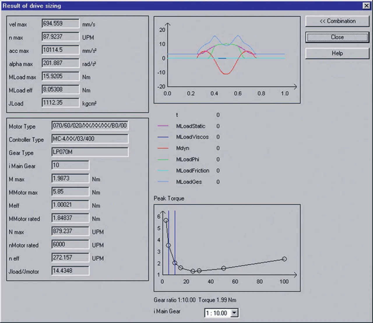 Die Forderung nach einer ruck- und stoßfreien Bewegung steht zwangsläufig oft in Widerspruch zum Ziel einer hohen Dynamik mit möglichst ökonomischen Antrieben und Mechaniken. Um trotzdem die richtige Auswahl treffen zu können, unterstützt das Engineering-Tool den Anwender dadurch, dass sich in sehr kurzer Zeit verschiedene Varianten durchspielen lassen. Indem der genannte Bewegungseditor die Bewegungsgesetze am Bildschirm visualisiert, erhält der Maschinenbauer einen Überblick über die auftretenden Wege, Geschwindigkeiten und Beschleunigungen. Zusammen mit den Bewegungsbibliotheken des Engineering-Systems steht dem Konstrukteur von Verpackungsmaschinen in Summe ein Werkzeug zur Verfügung, welches aufwendige Programme, die klassischer prozeduraler Software ähnlich sind, durch eine einfache grafische Beschreibung des Bewegungsablaufes einer Maschine ersetzt. Diese Vorgehensweise ist sehr praxisnah und ermöglicht auch mechanischen Konstrukteuren das Erstellen von Bewegungsprogrammen. Mit der Definition der Bewegungsabläufe ist es nicht getan. In einem nächsten Schritt sollte das Engineeringsystem den Konstrukteur bei der Auslegung der Antriebe unterstützen, sprich die optimale Kombination aus Motor, Servoantrieb und Getriebe für diesen Bewegungsablauf ermitteln.