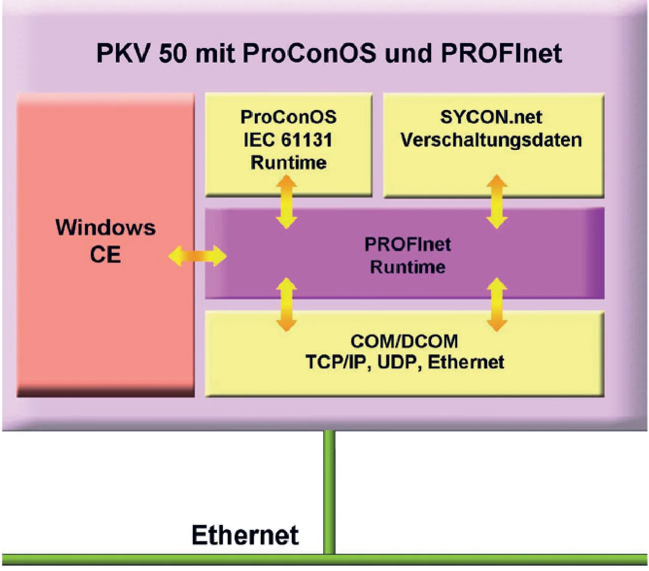 Die Profinet-Runtime-Implementierung haben beide Firmen exemplarisch anhand des PKV 50, dem auf Windows CE basierenden Ethernet Fieldbus Gateway von Hilscher realisiert. Als IEC-61131-Laufzeitsystem liefert ProConOS von KW-Software dem Profinet Runtime-Stack die Daten der Ein- und Ausgänge der im Sycon.net verschalteten Profinet-Komponente. Auf dem Komponentenmodell aufbauend tauscht der Runtime-Stack die Daten über TCP/IP und dem DCOM-Wire-Protokoll aus. Die Profinet-Komponenten sind in Form von Objekten abgebildet, deren Kommunikation durch die Mechanismen des Objektprotokolles gewährleistet ist.