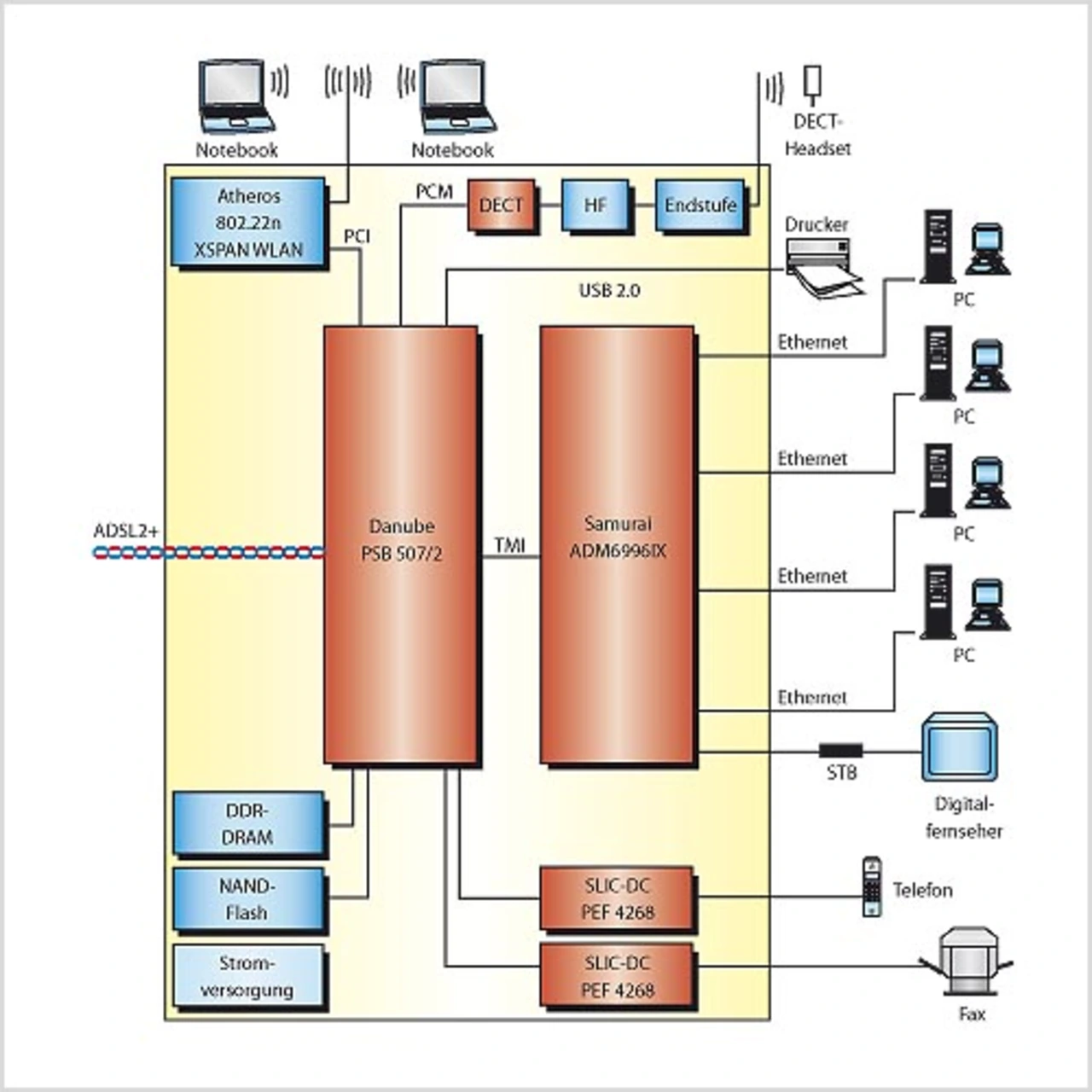 Zentraler Block auf dem „System on Chip“ (Bild 3) ist ein 32-bit-Mips-Prozessor mit „Multi Threading“-Architektur, der die wesentlichen Aufgaben bei der Verarbeitung der Datenpakete übernimmt. Der Hersteller spricht von einer „dynamischen“ Parallelverarbeitung, die zudem neueste QoS-Mechanismen implementiert. Auf dem Chip ist das ADSL-Modem StatiPHY2+ von Aware (www.aware.com) integriert (7120).
