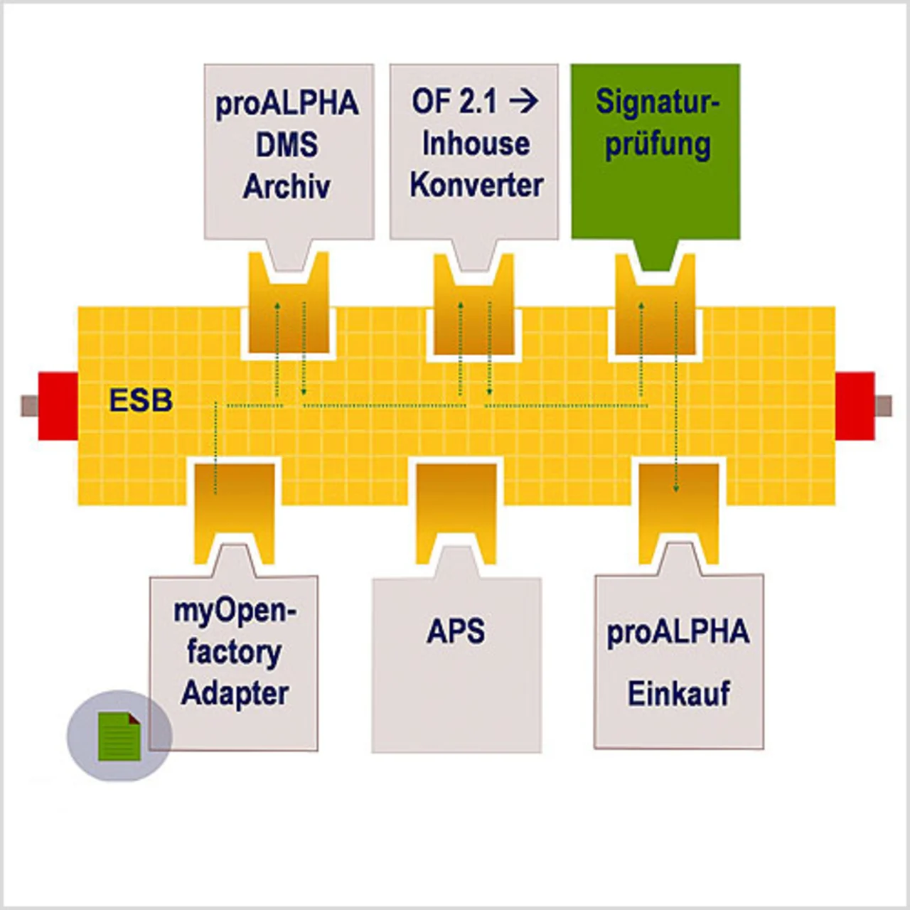 Die Firma Proalpha erlaubt es, diese Services in ihrer SOA-Suite zu einem Prozess zusammenzustellen. Seine Flexibilität kann dieser Ansatz ausspielen, wenn sich in den definierten Prozessabläufen Änderungen ergeben, beispielsweise neue Services wie „Signaturprüfung“ oder „Archivierung“ zu integrieren sind.