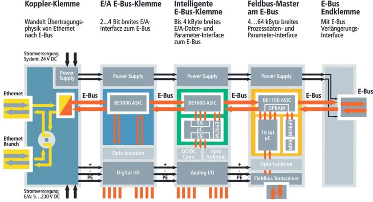Die Protokollstruktur von EtherCAT überwindet die prinzipielle Begrenzung dieser Ethernet-Lösungen. Das "Herzstück" des Konzeptes ist die in einen ASIC gegossene Fieldbus Memory Management Unit (FMMU), die sich in jeder Klemme befindet. Während das Telegramm die Klemme durchläuft, entnimmt die FMMU die für sie bestimmten Daten. Ebenso werden Eingangsdaten im Durchlauf in das Telegramm eingefügt. Die Verzögerung der Telegramme beträgt nur wenige Nanosekunden. Das Ethernet-Protokoll bleibt bei dieser Lösung bis in die einzelne Ethernet-Klemme erhalten. Lediglich die Übertragungsphysik wird im Koppler verzögerungsfrei von Twisted Pair beziehungsweise Lichtleiterphysik auf E-Bus gewandelt. Die Signalform dieses Klemmen-Systembusses eignet sich für Strecken bis 10 m auch zur Übertragung auf verdrillter Zweidrahtleitung. Hierdurch lässt sich die Klemmenreihe besonders kostengünstig verlängern.