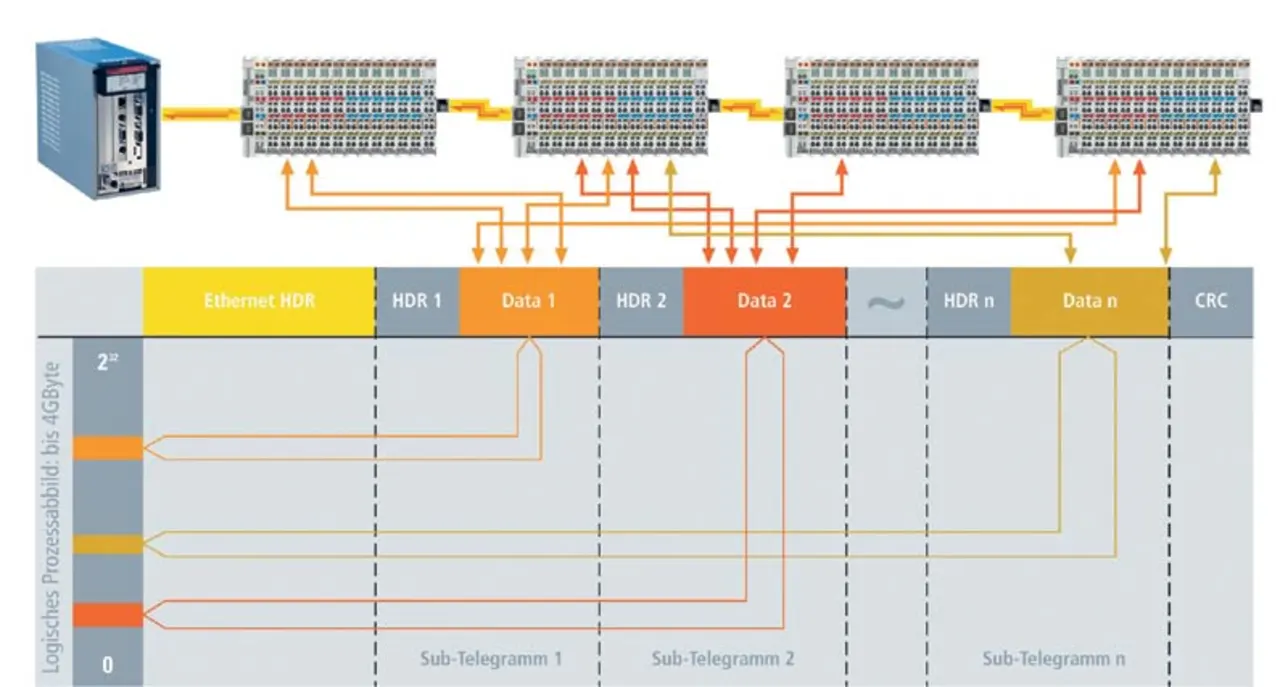 Auf Grund der Linienstruktur von EtherCAT anstelle Ethernet-Sterntopologie können teure Infrastrukturkomponenten entfallen. Die benötigten Schnittstellen für eine Kombination aus Linie und Abzweigen beziehungsweise Stichleitungen befinden sich auf den Buskopplern. Zusätzliche Switches werden nicht benötigt. Dennoch ist deren Einsatz und damit die Realisierung der klassischen Switch-basierten Ethernet-Sterntopologie möglich. Beliebige Ethernet-Geräte lassen sich innerhalb des EtherCAT-Stranges via Hub-Klemme anschließen. Geräte mit Feldbus-Anschluss werden über entsprechende Feldbus-Master-Klemmen integriert.