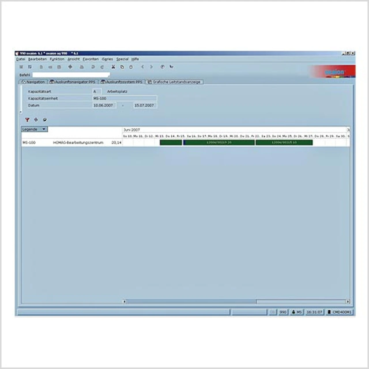 Um die Fertigungsabläufe exakt planen zu können, sollte das Software-Tool auch ohne MES jeden einzelnen Arbeitsplatz berücksichtigen können. Nur dann lassen sich die Arbeitsschritte in der wirtschaftlichsten Reihenfolge anordnen und auf außergewöhnliche Ereignisse kann schnell reagiert werden. Ein Beispiel dafür ist die grafische Ressourcenplanung der ERP-Lösung "oxaion". Das Tool steht innerhalb des PPS-Moduls (Produktionssteuerung und -planung) des ERP-Systems zur Verfügung und visualisiert die Einplanungen sämtlicher Arbeitsaufträge.