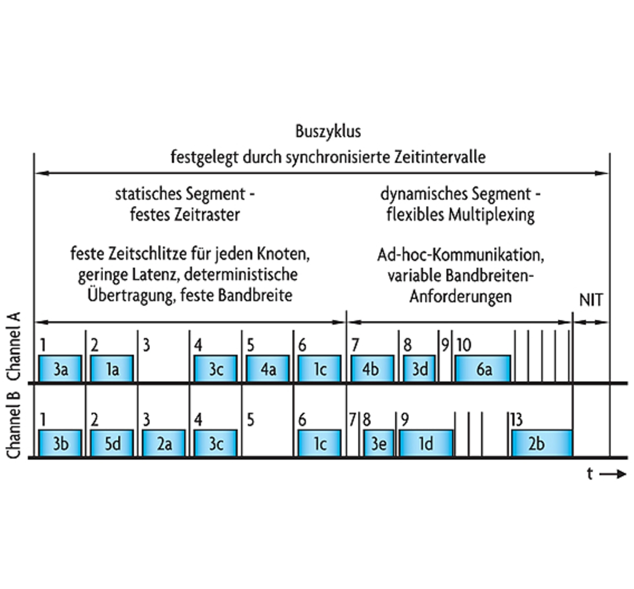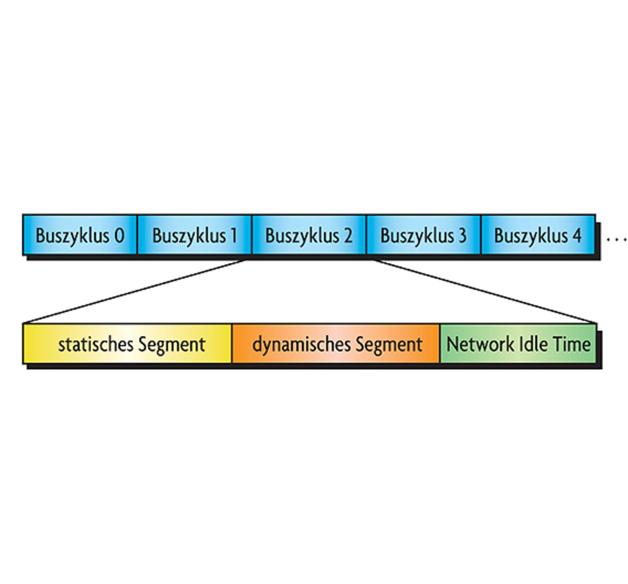 Bild 3 gibt eine ausführliche Übersicht über die Rahmenabfolge des Protokolls. Dies zeigt deutlich die feste Länge der statischen Fenster hoher Priorität und die variable Länge der dynamischen Segmente. Die Abbildung veranschaulicht auch, dass hochpriore Daten eine garantierte Latenz haben und nicht durch Buskonflikte verzögert werden.