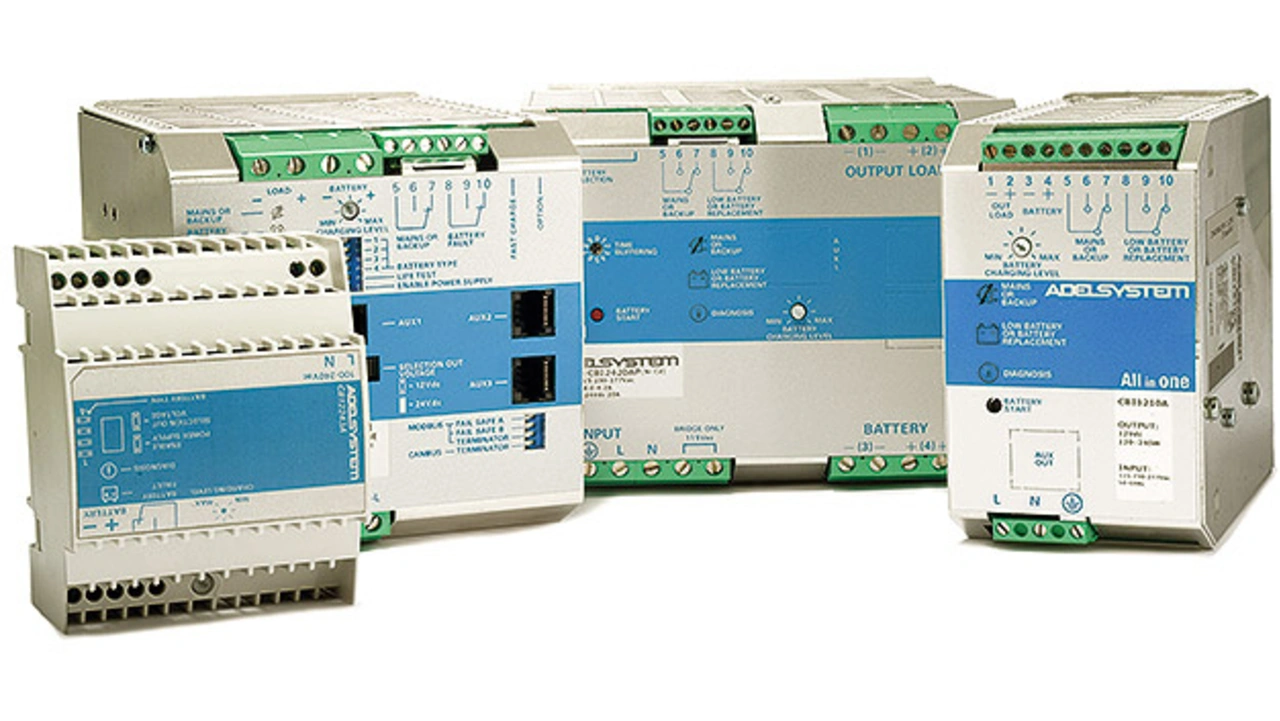 Das DC-USV-System von Adelsystem ist ein kompaktes Produkt für 12-, 24- und 48-V-Hutschienensysteme mit einem Strombedarf von 3 A bis zu 35 A und mit Spitzenbelastbarkeit bis zum dreifachen Nennstrom (Bild 1). Neben der eigentlichen USV-Logik enthalten diese All-in-One-Geräte auch ein Netzteil und ein Batterieladegerät. Auch Back-up-Batterien mit jeweils bis zu 7,2 Ah lassen sich mit auf die Hutschiene montieren. So kann statt nur eines klassischen Hutschienen-Netzteils an gleicher Stelle eine komplett ausfallsichere Stromversorgung realisiert werden.