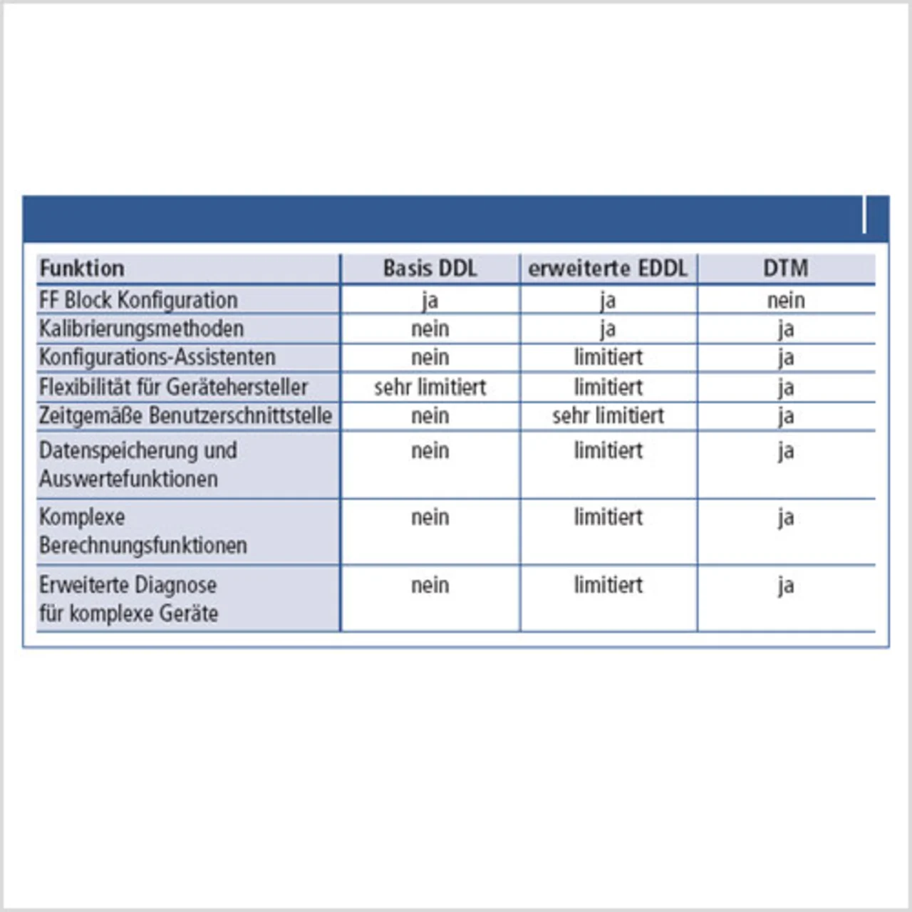 Hinsichtlich der Bedienoberflächen und der Funktionalität unterscheiden sich die drei Integrationstechnologien signifikant: Bei den Beschreibungssprachen DDL und eEDDL sind die Möglichkeiten für den Gerätehersteller zur Gestaltung einer Bedienoberfläche grundsätzlich durch den Sprachumfang vorgegeben. Die Darstellung einer DDL/eEDDL-basierten Oberfläche in einem bestimmten Host-System hängt weiterhin davon ab, welche Sprachkonstrukte der Host beherrscht.DDLs erlauben lediglich eine einfache Listendarstellung der Parameter, die sich mit Hilfe von Karteireitern (Tabcards) strukturieren lassen. Grafische Darstellungen sind bei DLLs nicht vorgesehen – im Gegensatz zur eEDDL. Allerdings sind deren Inhalte wiederum vordefiniert. Bei einzelnen Engineering-Funktionen der eEDDL traten Probleme auf, beispielsweise beim Funktionstest (Step-Test) der Stellungsregler: Die Mess-Ergebnisse gingen bei einem Wechsel des Menüfensters verloren und ließen sich generell nicht speichern.