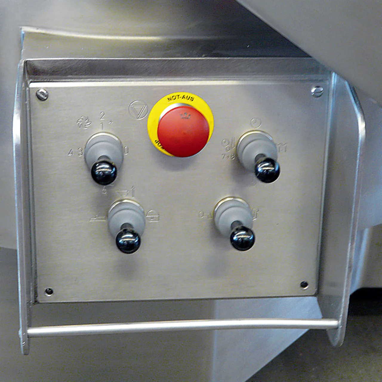 Alle Bedienelemente sind ergonomisch angeordnet und die Funktionen können ohne Blickkontakt bedient werden. Dies wird mittels Bedientableaus erreicht, die mit Drucktastern, Wahlschaltern und Leuchtmeldern aus dem N-Programm von Elan sowie mit Kreuzhebeltastern ausgestattet sind. Die letztgenannten Schaltgeräte können über den Betätigungshebel in bis zu vier Richtungen bewegt werden und dabei jeweils unterschiedliche Funktionen auslösen. Jeder Schalter ist mit logisch zusammenhängenden Funktionen belegt, so dass sich die Maschinen intuitiv bedienen lassen und Fehlbedienungen unwahrscheinlich sind. Zudem haben die Konstrukteure gegenseitige elektrische Verriegelungen vorgesehen, die eine kombinierte Betätigung solcher Funktionen ausschließen, die nicht zusammenpassen. Auf diese Weise lässt sich die Menge der Bedienelemente eingrenzen.