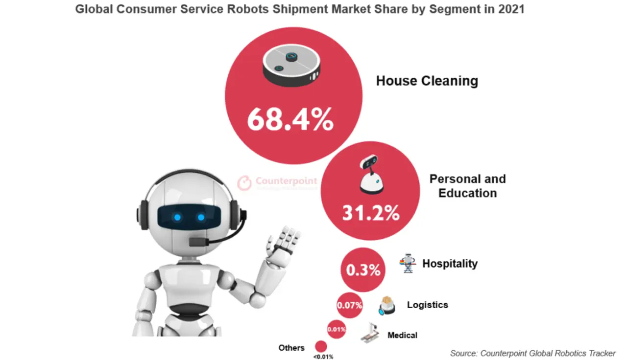 Der globale Markt für Consumer-Servicerobotik verzeichnete 2021 ein Lieferwachstum von 25 % im Vergleich zum Vorjahr und wird in den nächsten vier Jahren mit einer CAGR von 27 % wachsen, so die neueste Studie des IoT-Service von Counterpoint.