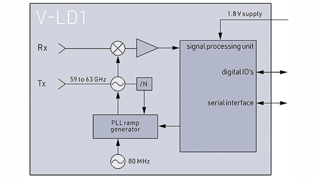 Bild 4 zeigt die Blockschaltung des V-LD1. Der PLL-Sägezahn-Generator moduliert das Sendesignal im Bereich zwischen 59 GHz und 63 GHz mit einer Modulationsbandbreite von maximal 4 GHz. Der Mischer bildet die Differenzfrequenz zwischen dem Rx- und Tx-Signal und leitet dieses über eine Verstärkerstufe an den DSP-Controller weiter. Der Controller berechnet die Distanz-FFT und sucht auf Basis einstellbarer Parameter und Filter ein Ziel. Dieses Ziel hat eine Auflösung im Zentimeterbereich. Der Sensor hat aber noch eine erweiterte Signalverarbeitung an Bord, welche die Auflösung für das Einzelziel im Millimeterbereich ermöglicht. Das Ergebnis der Distanzmessung steht Anwendern danach über eine digitale UART-Schnittstelle zur Verfügung.