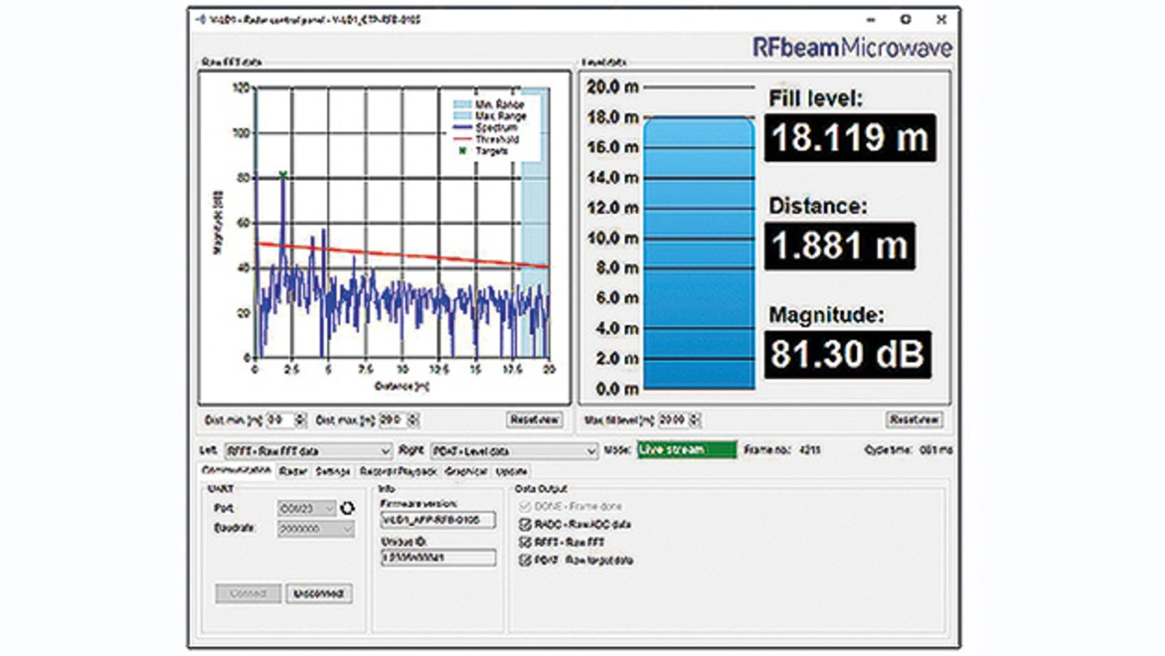 das Radarmodul zu konfigurieren und die Rohdaten der FFT direkt in Echtzeit zu beobachten, auch eine grafische Darstellung einer Abstandsmessung am Beispiel eines Füllstands in einem 20 m hohen Silo. Der höchste Peak in der FFT (in Bild 6 mit einem grünen Kreuz markiert) entspricht dem gemessenen Abstand (1.881 m), was einem Füllstand von 18,119 m entspricht.