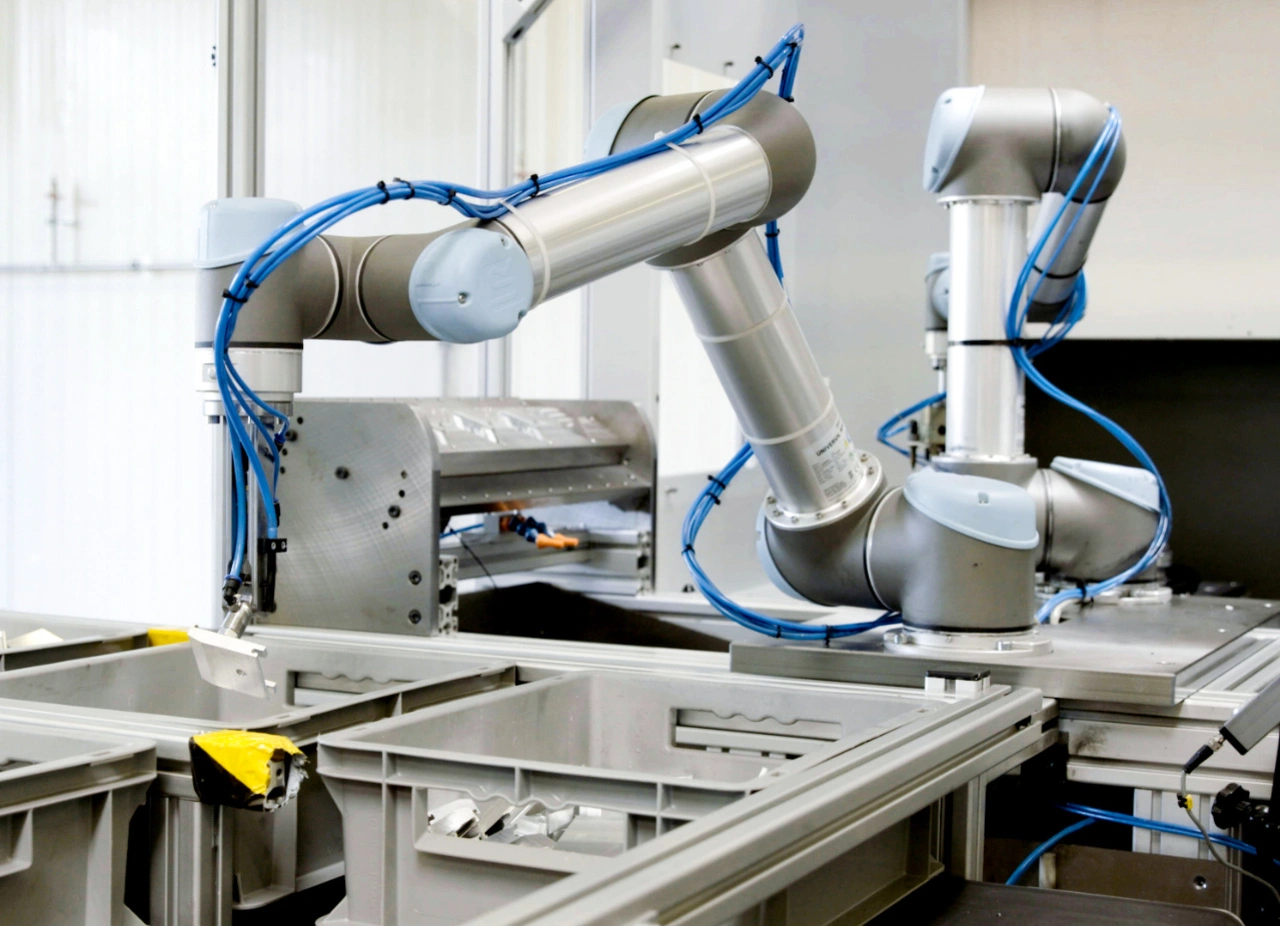 Im hauseigenen CNC-Maschinenpark fertigt der Zulieferer Losgrößen zwischen 500 und maximal 5000 Stück. Gemeinsam mit dem UR-Partner STB Steuerungstechnik Beck entwickelte Jenny | Waltle eine Bin-Picking-Applikation mit zwei UR-Cobots des Typs UR5. Der UR5 kann ein Maximalgewicht von 5 kg heben. Im Zweischichtbetrieb handhaben die Cobots täglich bis zu 2400 Aluminiumteile. Dafür ist einer der zwei UR5 mit einem 3D-Kamerasystem verknüpft. Die externe Kamera scannt zunächst die vorgesägten Aluminiumteile und generiert daraus einen 3D-Datensatz – die sogenannte Punktwolke. So erkennt der erste Cobot die komplexen Oberflächenstrukturen und die genaue Anordnung der Objekte. Ausgestattet mit einem Vakuumgreifer entnimmt er anschließend Teil für Teil aus dem Behälter. Eine zusätzliche Achse am Werkzeugflansch ermöglicht dem Cobot eine kollisionsfreie und exakte Werkstückaufnahme. Für möglichst hohe Präzision im Griff richtet er das Teil anschließend in einer Zwischenablage aus. Sitzt das Teil korrekt, legt der UR5 es in eine weitere Ablage. Hier übernimmt der zweite Cobot, der die Komponenten präzise im hydraulischen Spanner der CNC-Fräse platziert. Nach der Bearbeitung durch die Maschine greift er die Teile und legt sie in eine finale Ablage, von welcher der erste Cobot sie dann in eine leere Kiste fallen lässt.