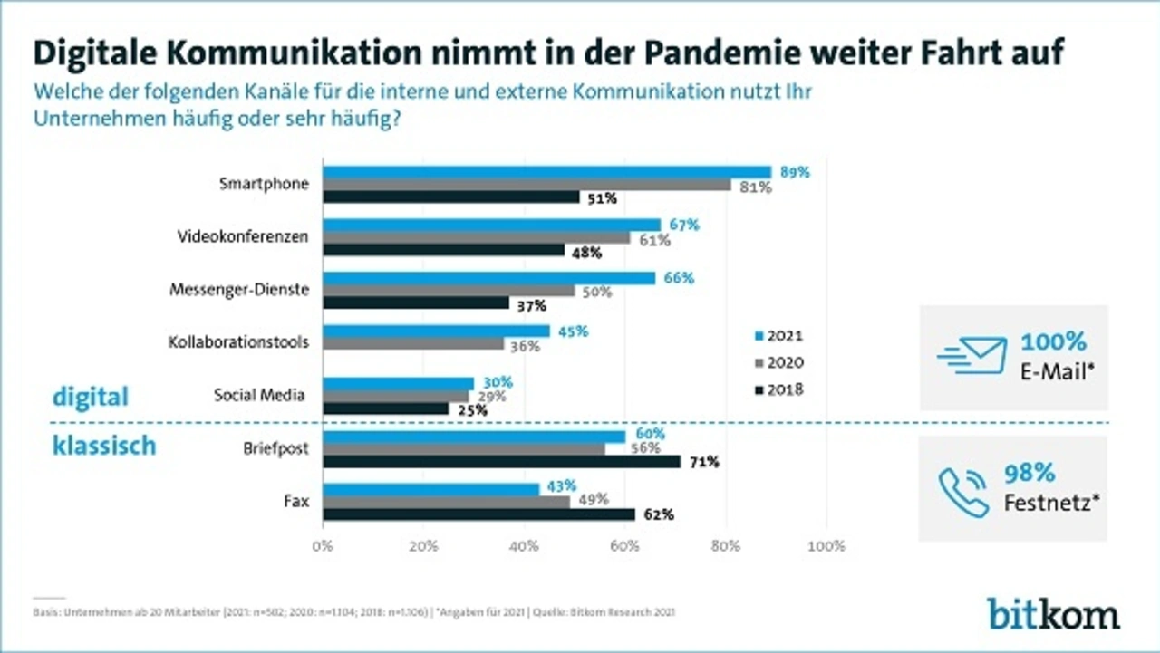 So nutzen zwei Drittel (66 Prozent) häufig Messenger-Dienste, vor einem Jahr waren es erst 50 Prozent, vor drei Jahren sogar nur 37 Prozent. Und 45 Prozent setzen häufig Kollaborationstools ein, vor einem Jahr waren es 36 Prozent. Auch Videokonferenzen sind in der Pandemie zum Standard geworden. Zweit Drittel (67 Prozent) nutzen sie häufig, vor einem Jahr zu Beginn der Pandemie waren es erst 61 Prozent und vor drei Jahren gerade einmal 48 Prozent. Auch das Smartphone legt mit 89 Prozent nach 81 Prozent (2020) und 51 Prozent (2018) auf hohem Niveau noch einmal zu. Fast keine Veränderung zum Vorjahr gibt es mit 30 Prozent bei Social Media (2020: 29 Prozent, 2018: 25 Prozent) – und unverändert alle Unternehmen nutzen häufig E-Mail.