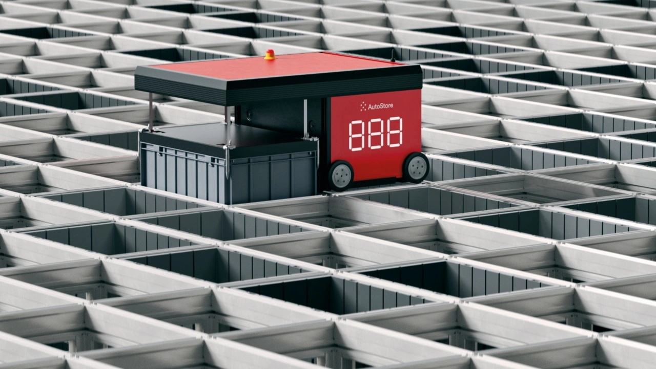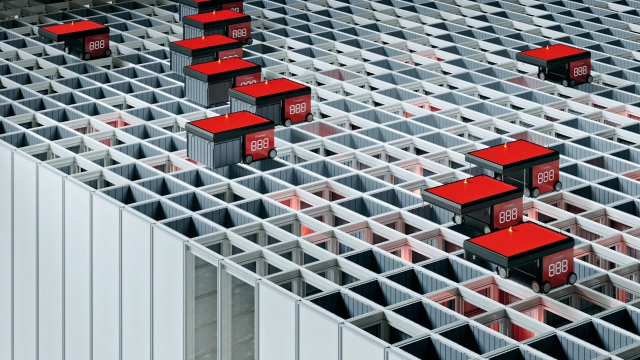 Die Bins werden im sogenannten Grid gelagert, dem Herzstück jedes Cube-Storage-Systems. Diese Konstruktion aus Aluminiumprofilen kann sich flexibel verschiedenen Grundrissen anpassen. Dabei spielt es keine Rolle, ob eine Lagerfläche rechteckig, dreieckig, L-förmig oder unregelmäßig ist. Das Grid lässt sich auch um Stützpfeiler und andere Baustrukturen herumbauen. Weil das System aus nur wenigen Arten von – noch dazu standardisierten – Teilen besteht, geht der Aufbau schnell vonstatten. Oberhalb des Grids bewegen sich Roboter entlang von Schienen in x- und y-Richtung. Mit einem Liftarm können sie nach unten greifen und Bins herausholen oder umschichten. Intelligente Algorithmen sorgen dafür, dass häufig benötigte Behälter möglichst weit oben im Grid gelagert werden und die Roboter so selten wie möglich tief graben müssen. Durch effiziente Prozesse gelangt man zudem auch an Bins, die in den unteren Schichten gelagert werden.