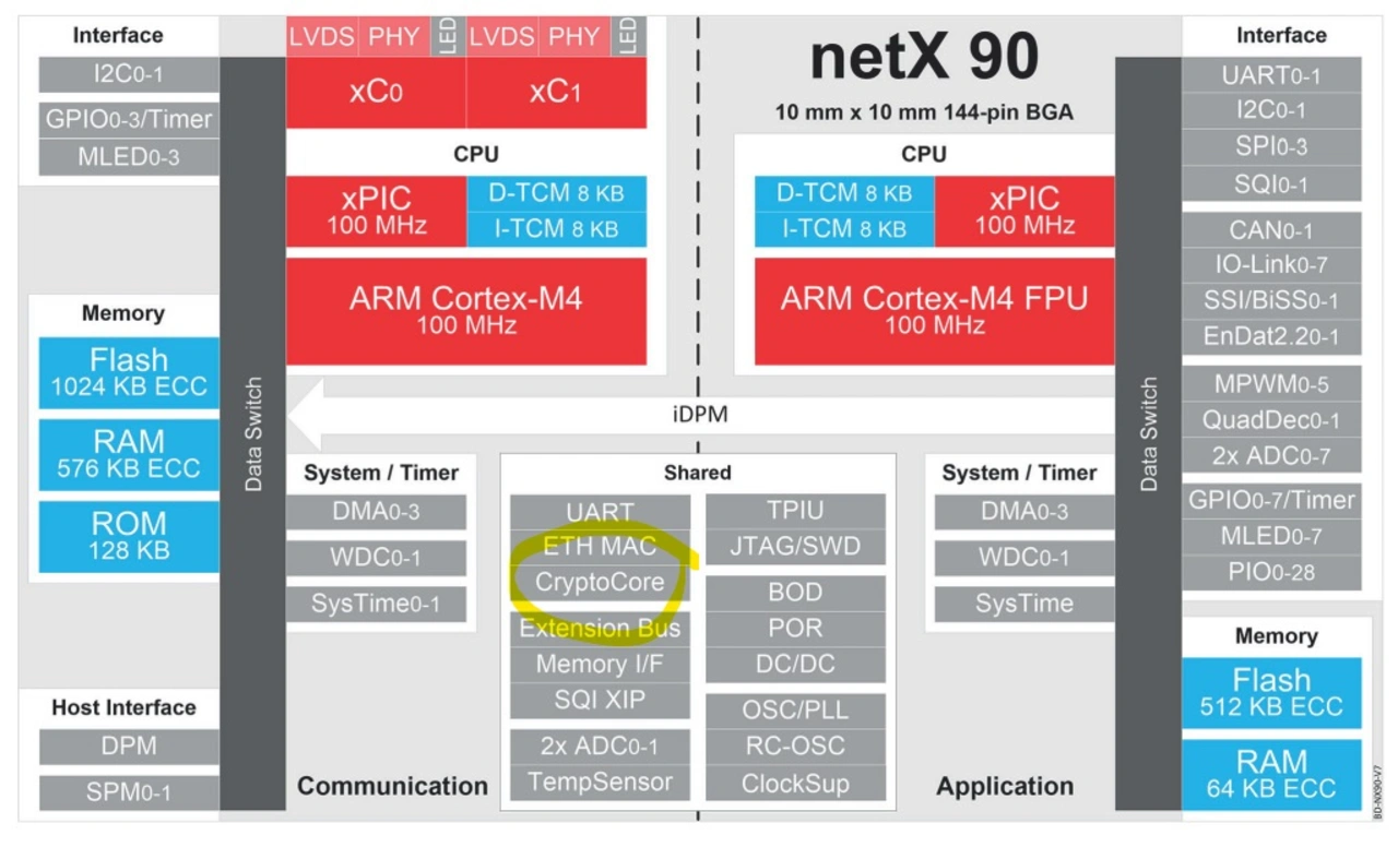 Herzstück der Sicherheitsfunktionen des netX 90 ist der Cryptocore. Hierbei handelt es sich um einen Hardwareblock, der kryptografische Algorithmen signifikant beschleunigt. Besonders bei der Ver- und Entschlüsselung zyklischer Prozessdaten ist eine Hardwarebeschleunigung obligatorisch, um die negativen Auswirkungen auf die Performance, in diesem Fall die Zykluszeit, klein zu halten. Die Verschlüsselung größerer Datenmengen erfolgt üblicherweise mit symmetrischen Blockchiffre-Verfahren wie Advanced Encryption Standard (AES). Bei Schlüssellängen von 256 Bit beschleunigt die Hardware diesen Algorithmus mindestens um den Faktor 15 gegenüber einer reinen Berechnung durch die CPU. Für die Authentifizierung von Teilnehmern, Signierung von Nachrichten und Etablierung einer sicheren Verbindung werden asymmetrische Verschlüsselungsverfahren verwendet. Anstatt eines gemeinsamen Sicherheitsschlüssels, wie er bei symmetrischen Verfahren genutzt wird, kommt hier ein Schlüsselpaar aus privatem und öffentlichem Schlüssel zum Einsatz. Solche Verfahren sind noch rechenaufwendiger. Der Cryptocore des netX 90 bietet Unterstützung für die verbreiteten Verfahren RSA (Rivest-Shamir-Adleman) und ECC (Elliptic Curve Cryptography). Daneben gibt es weitere Hilfsfunktionen wie einen True-Random-Number-Generator und SHA sowie MD5-Hash-Wert-Berechnung in der Hardware.