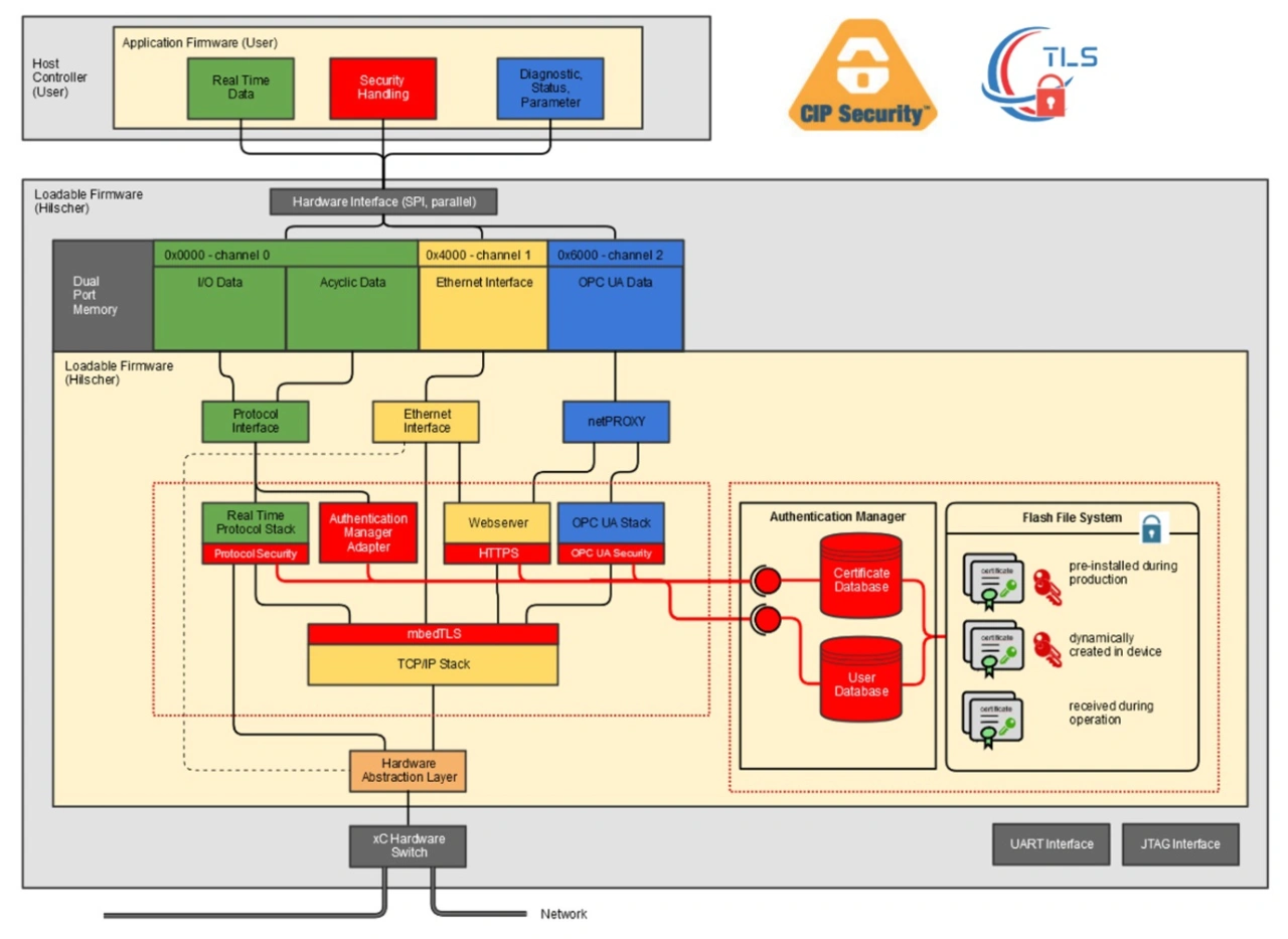 Hilscher verwendet in seiner EtherNet/IP-CIP-Security-Protokoll-Firmware die mbed-TLS-Implementierung. Diese lässt sich als Security-Software-Baukasten betrachten, der über dem TCP/IP-Stack platziert ist und Hardware-Funktionen des Cryptocores nutzt.