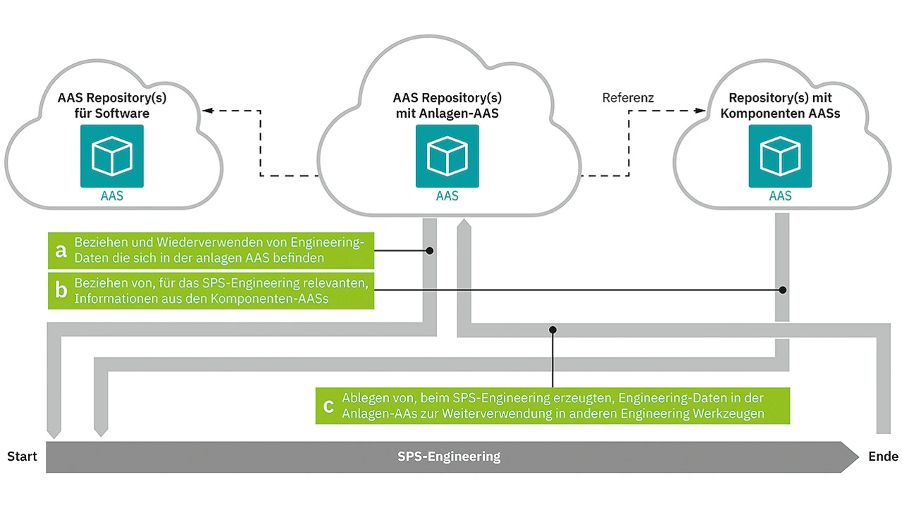 Bild 5 zeigt die drei Engineering- Use-Cases während des SPS-Engineerings. In Use Case a sollen im SPS-Engineering die Engineering-Daten aus vorherigen SPS-Engineering-Projekten verwendet werden, um Teile des SPS-Engineering-Projekts automatisch zu generieren. Informationen aus Schalt- oder Bestückungsplänen könnten beispielsweise genutzt werden, damit sich im SPS-Engineering-Projekt Variablen, Ein-/Ausgangszuweisungen oder Feldbuskonfigurationen automatisch erstellen lassen. In Use Case b geht es darum, Informationen aus den in den Komponenten-AAS enthaltenen Daten im SPS-Engineering wiederzuverwenden. So könnten beispielsweise komplexere Feldgeräte die Informationen, die zu ihrer Integration in die Anlagen-AAS erforderlich sind, in ihrer AAS bereithalten. Oder Feldgeräte, die über ein Kommunikationssystem angeschlossen sind, stellen in ihrer AAS die Konfiguration ihrer Kommunikations-schnittstelle zur Verfügung.