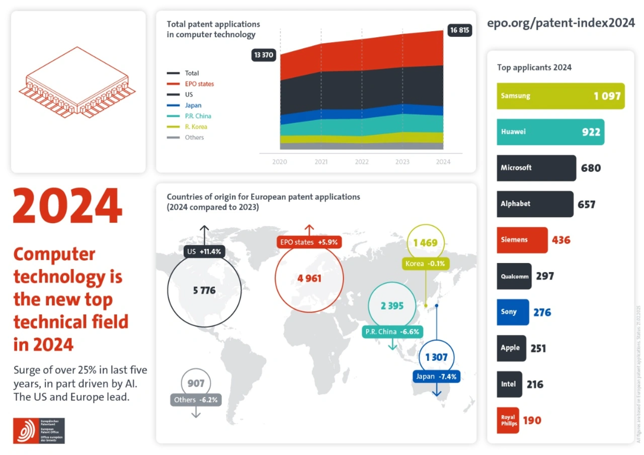 Drei deutsche Unternehmen gehörten 2024 zu den Top 20 der Patentanmelder im Bereich Computertechnologie beim EPA: Siemens auf Platz 5, Bosch auf Platz 12 (gestiegen von Platz 17 im Jahr 2023) und die Fraunhofer-Gesellschaft auf Platz 17.