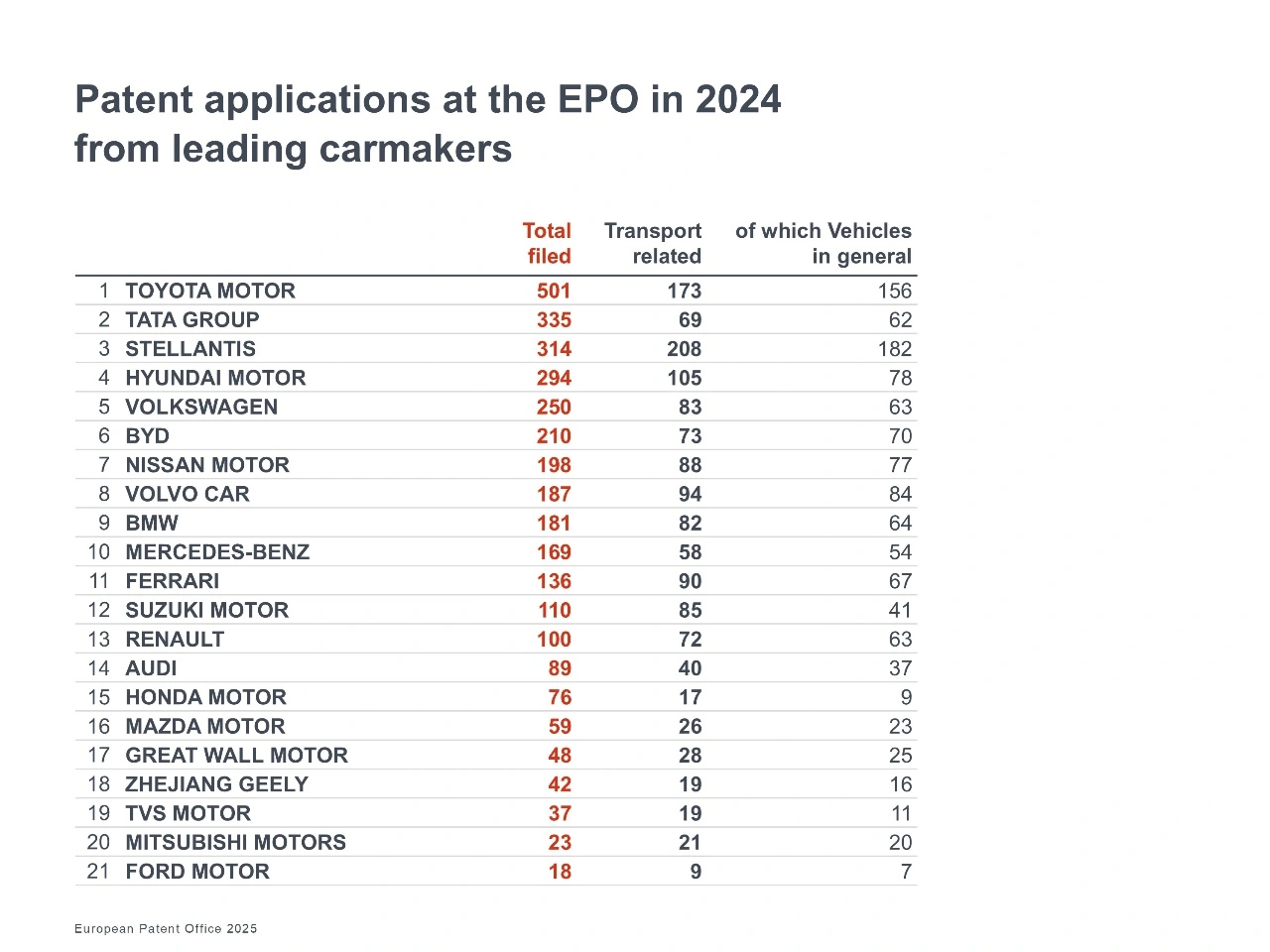 Vier deutsche Unternehmen gehören zu den Top 10 der Patentanmelder im Transportsektor beim EPA: Siemens (Platz 5), Continental (Platz 6, gestiegen von Platz 8 in 2023), ZF Friedrichshafen (Platz 8, gestiegen von Platz 11) und Robert Bosch (Platz 9). Siemens und Bosch zählen zudem zu den Top 10 der Patentanmelder im Bereich Elektrofahrzeuge.