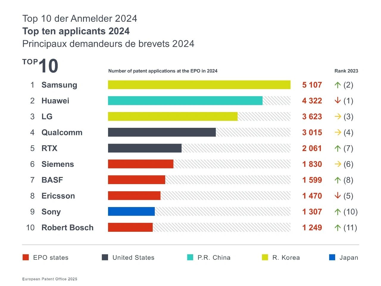 Deutsche Unternehmen zählen zu den aktivsten Patentanmeldern In der globalen Top-10-Rangliste der Patentanmelder des EPA waren im Jahr 2024 drei deutsche Unternehmen vertreten, eine Steigerung gegenüber zwei im Jahr 2023. Siemens belegte Platz 6 mit 1.830 Anmeldungen, BASF Platz 7 mit 1.599 Anmeldungen und Robert Bosch Platz 10 mit 1.249 Anmeldungen. Die Rangliste der aktivsten Patentanmelder beim EPA wird 2024 von drei asiatischen Unternehmen und zwei US-amerikanischen Unternehmen angeführt: Samsung, Huawei, LG, Qualcomm und RTX. Insgesamt sind zwölf deutsche Unternehmen und Forschungseinrichtungen unter den Top 100 des EPA vertreten.