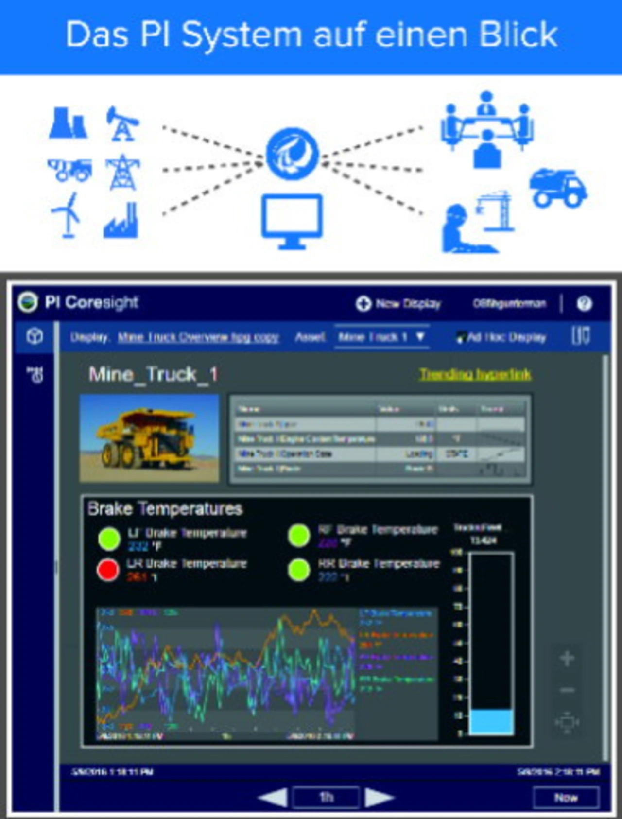 Beim PI System handelt es sich um eine Infrastruktur für industrielle Zeitreihendaten und eine dafür optimierte Datenbank. Das PI System nimmt die Daten auf, analysiert und visualisiert sie. Dazu führt es Echtzeitberechnungen je nach Kundenwunsch durch. Beispielsweise berechnet das PI System einen Durchfluss oder erkennt im Rahmen eines statistischen Modells „Ausreißer“, und zwar im Millisekunden-Bereich. Daraufhin kann es sofort den Operator alarmieren.