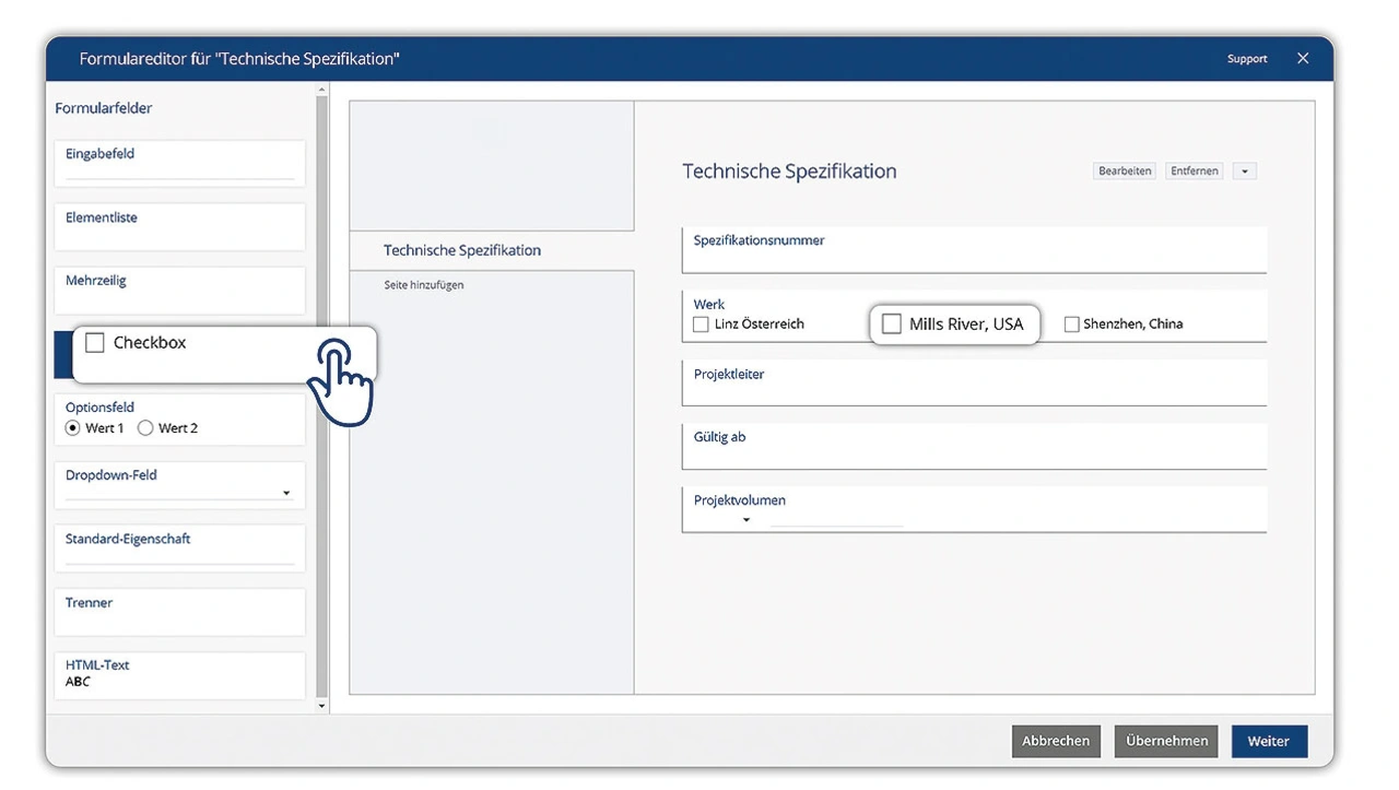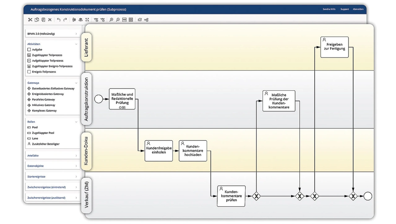 Falls die standardmäßig verfügbaren Prozess- und Workflow-Modelle nicht ausreichen, erlauben in den meisten CDP-Applikationen grafische Editoren auf Low/No-Code-Basis, dass auch Mitarbeitende ohne Programmierkenntnisse Checklisten, Abnahmeprotokolle oder Prüfpläne modellieren und in Gang setzen können (Bild 1).