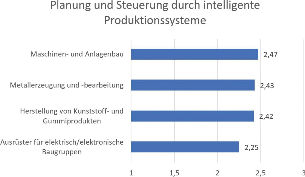 Das Modul »Planung und Steuerung durch intelligente Produktionssysteme« umfasst insgesamt elf Fragen zur Nutzung und Verarbeitung von Daten aus der Produktion, zum Einsatz von Systemen für Produktionsplanung und -steuerung (PPS), zur digitalen Fabrik und zur IT-Infrastruktur der Fertigung. Hier liegt die Führung mit einem Digitalisierungsgrad von immerhin 2,47 beim Maschinen- und Anlagenbau (Bild 2). Der Unterschied zwischen den oberen drei Branchen ist allerdings sehr gering. Auffallend ist, dass bei den Aspekten der Digitalisierung in der Fabrik offenbar der beste Digitalisierungsstand im Vergleich zu den übrigen Modulen erreicht wird.
