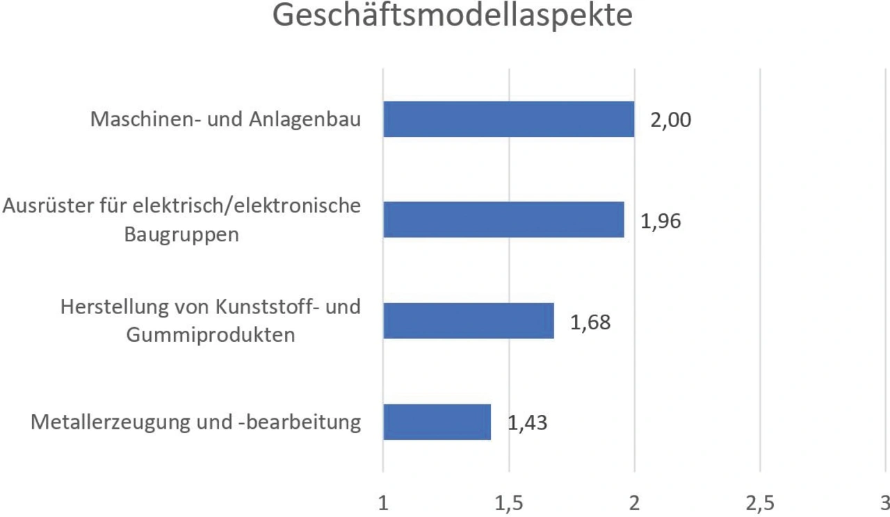 Im Modul »Geschäftsmodellaspekte« wurden insgesamt acht Fragen zum Umsatzanteil digitaler Services, zum digitalen Leistungsangebot sowie zum Einsatz von Plattformen gestellt. Der Maschinen- und Anlagenbau führt hier knapp vor den Ausrüstern für elektrische/elektronische Baugruppen (Bild 3). Aber auch hier gilt: Mit Werten bis maximal 2,0 wird lediglich bestätigt, dass die Möglichkeiten der Erweiterung der Geschäftsmodelle »in geringem Maße« genutzt werden. Noch immer dominiert im Rückschluss der reine Verkauf der Produkte das Geschäftsmodell. Die Chancen digitaler Services werden bestenfalls in Ansätzen verfolgt.