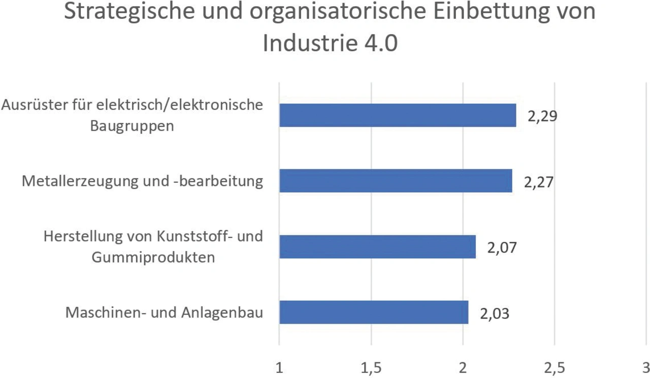 Im Modul »Strategische und organisatorische Einbettung von Industrie 4.0« wurden die meisten Fragen gestellt, nämlich 15. Die Fragen bezogen sich auf Lean Management, visuelles Management, IT-Sicherheit, Datensicherheit, Standards für die Datenübermittlung sowie Wissens- und Kompetenzmanagement. Ausrüster für elektrische/elektronische Baugruppen sowie die Metallerzeugung und -bearbeitung liegen hier fast gleichauf mit Digitalisierungsgraden knapp unter 2,3.