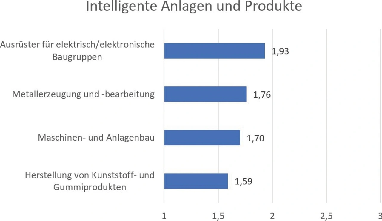 Zum Modul »Intelligente Anlagen und Produkte« wurden 14 Fragen gestellt. Thematisch wurden die Aspekte der Produktion mit intelligenten Maschinen und Anlagen, der Herstellung »intelligenter« (smarter) Produkte, des Einsatzes von Sensorik und Aktorik in der Fertigung, der Mensch-Roboter-Kollaboration, des Einsatzes von Augmented und Virtual Reality, der Maschine-zu-Maschine-Kommunikation sowie der Robotik abgefragt. Hier zeigt sich in der Höhe der Digitalisierungsgrade ein ähnliches Bild wie beim Modul Geschäftsmodellaspekte. Werte von 2,0 oder höher werden nicht erreicht. Vorne liegen mit 1,93 die Ausrüster für elektrische/elektronische Baugruppen mit doch deutlichem Abstand (Bild 5).