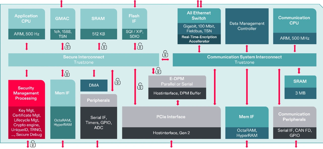 Die grundsätzliche Architektur des netX 900 ist der des netX 90 ähnlich. »Wir haben die Trennung von Applikations- und Kommunikationsseite beibehalten«, hieß es bei Hilscher dazu. In der neuen Architektur sind zunächst zwei Echtzeitkanäle vorgesehen.