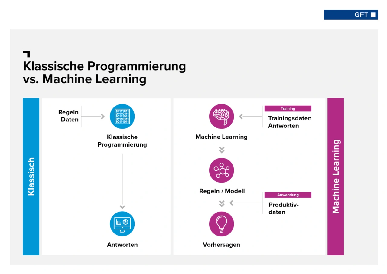 Was ist eigentlich Künstliche Intelligenz? Fragt man Laien, lautet die Antwort oft: Maschinen, die mindestens so intelligent sind wie der Mensch, also wie in Filmen wie „I, Robot“ oder „Terminator“. Von dieser „starken“ KI sind wir aber noch weit entfernt. Etabliert hat sich dagegen die „schwache“ KI, die vorwiegend auf Machine Learning beruht. Ein ML-Algorithmus arbeitet nicht nur vorgegebene Regeln ab und liefert damit vorhersehbare Ergebnisse wie klassische, heuristische Algorithmen. Stattdessen erarbeitet er sich diese Regeln selbst und lernt aus Erfahrung. Aus Daten mit vorgegebenen Lösungen erkennt er selbstständig Muster und trifft Aussagen über die Zukunft.