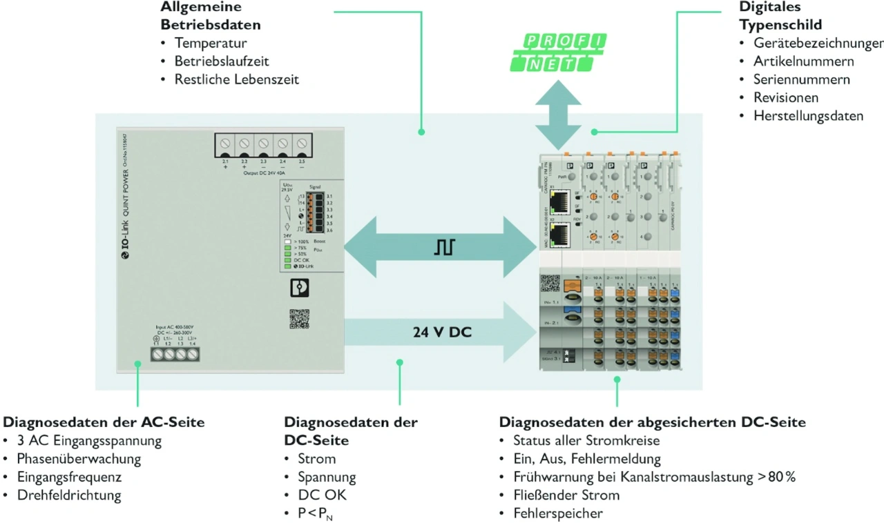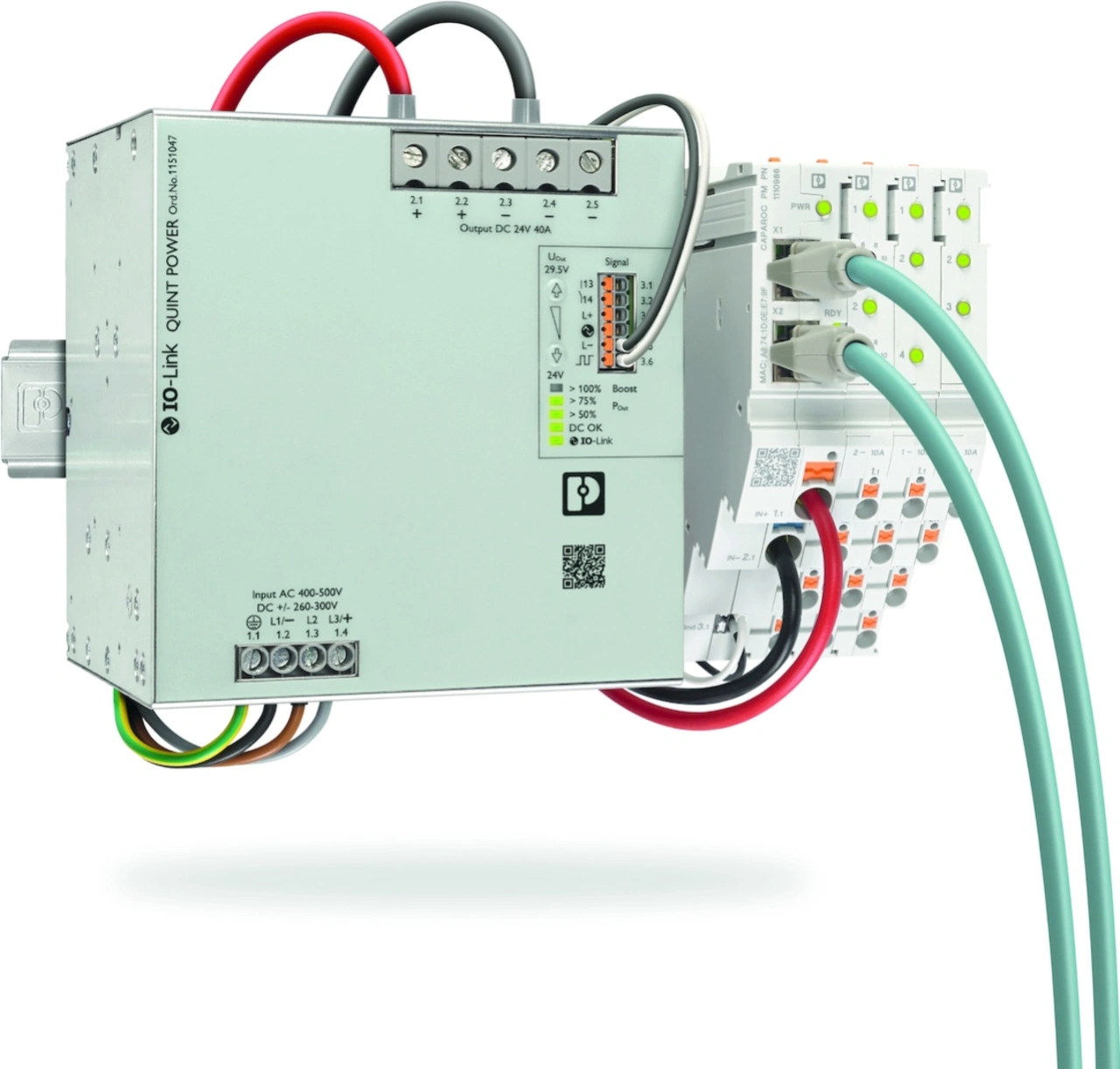 Smart Reliable Power Supply ergänzt das Portfolio der Digital Factory now um ein Konzept für die Stromversorgung. Aufgrund der smarten Verknüpfung der Stromversorgung Quint Power (20 A oder 40 A) mit dem Geräteschutzschaltersystem Caparoc wird das 24-V-Versorgungssystem einer Produktionsanlage digitalisiert. Die zur Verfügung gestellten Daten lassen sich über das Profinet-Protokoll im übergeordneten Automatisierungssystem auslesen.