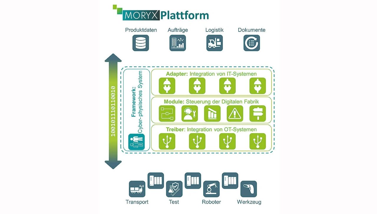 Um die Komplexität der übergreifenden Logik und Datenhaltung der wertschöpfenden Prozesse zu beherrschen, wurden die Daten und ihre Verwaltung aus den SPS-Systemen in die Ebene der übergeordneten Moryx-Plattform überführt. So entsteht eine innovative und flexible Lösung, die kompatibel zu verschiedenen SPS-Systemen ist und zudem statt der dezentralen Programmierung durch Entwickler eine zentrale Konfiguration durch die Mitarbeitenden der Fabrik ermöglicht (Bild 1).