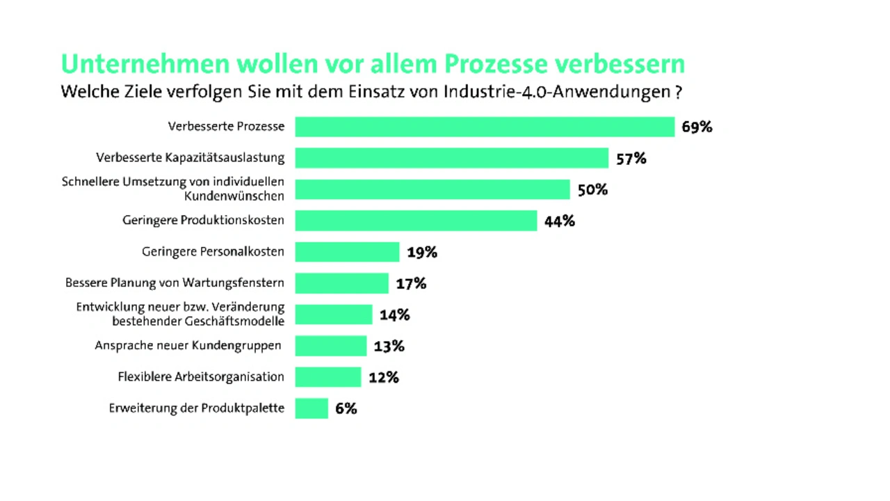 Laut der Bitkom-Befragung verfolgen die Anwender und Planer von Industrie 4.0 damit vor allem das Ziel, ihre Prozesse zu optimieren und die Kapazitätsauslastung in ihren Fabriken zu verbessern. 69 bzw. 57% nennen diese Punkte unter den drei wichtigsten Zielen. Rund die Hälfte (50%) erhofft sich vor allem eine schnellere Umsetzung individueller Kundenwünsche.