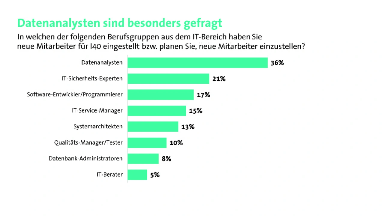 Industrie 4.0 hat auch Auswirkungen auf die Arbeit in der vernetzten Fabrik. So haben 11% der Unternehmen, die Industrie 4.0 anwenden oder dies planen, im vergangenen Jahr neue Mitarbeiter für diesen Bereich eingestellt, 15% planen das für dieses Jahr. Am gefragtesten aus der Gruppe der IT-Berufe sind dabei Datenanalysten: 36% der Unternehmen, die Mitarbeiter für Industrie 4.0 eingestellt haben oder dies planen, nennen diese Berufsgruppe. IT-Sicherheitsexperten stehen mit 21% an zweiter Stelle. Eingestellt wurden oder werden zudem Software-Entwickler bzw. Programmierer (17%), IT-Service Manager (15%), Systemarchitekten (13%) und Qualitatsmanager/Tester (10%). Zudem will jedes zweite Unternehmen (51%), das bereits Industrie 4.0 nutzt oder dies plant, in diesem Jahr Mitarbeiter weiterbilden. 43% haben das im vergangenen Jahr getan. Entlassungen infolge von Industrie 4.0 sind dagegen kaum geplant: Nur 6% der Anwender und Planer haben im vergangenen Jahr Stellen abgebaut, 7% wollen das dieses Jahr tun.