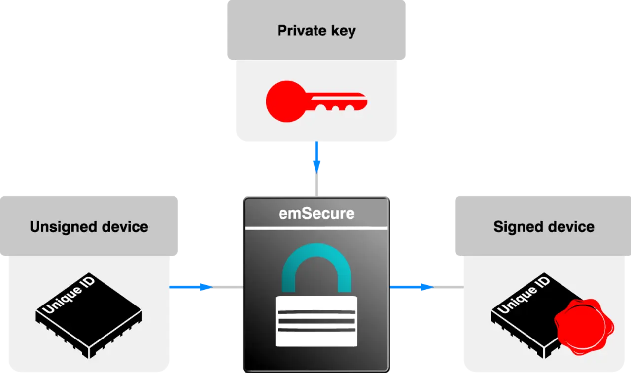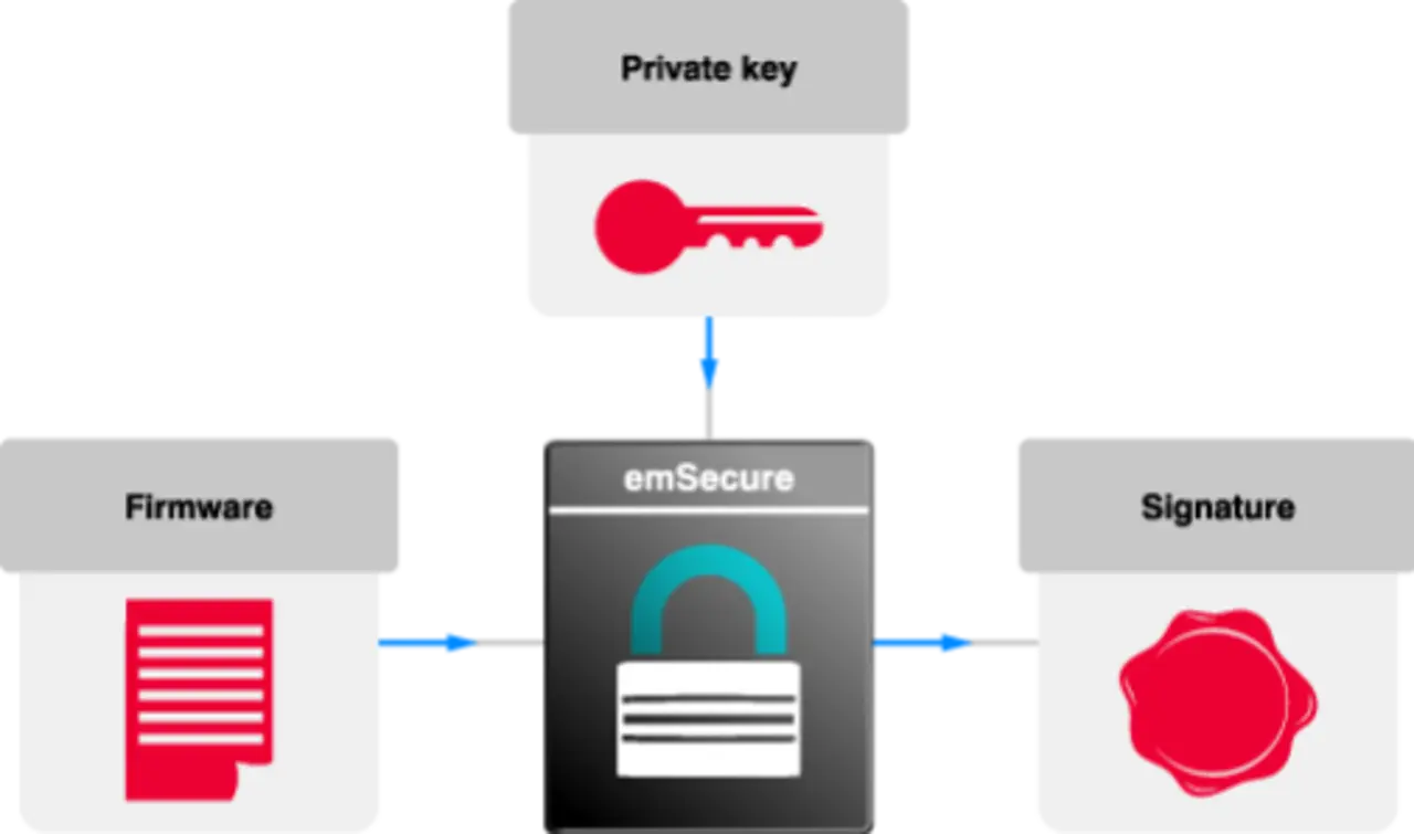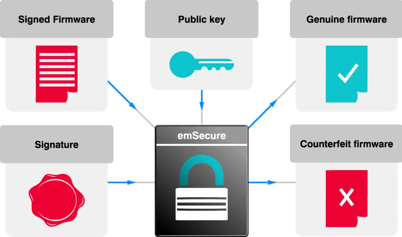 emSecure bietet eine einfache, aber wirksame Methode, um diese Bedrohungen zu bekämpfen. Dazu werden digitale Signaturen genutzt, die mit einem privaten Schlüssel erzeugt und mit einem öffentlichen Schlüssel verifiziert werden. Jedes Firmware-Update wird vom Hersteller mit einem privaten Schlüssel signiert. Das Gerät prüft anschließend, ob das Update mit dem öffentlichen Schlüssel verifiziert werden kann. Ist dies nicht möglich, wird das Update gestoppt – ein Schutzmechanismus, der Manipulationen fast unmöglich macht.