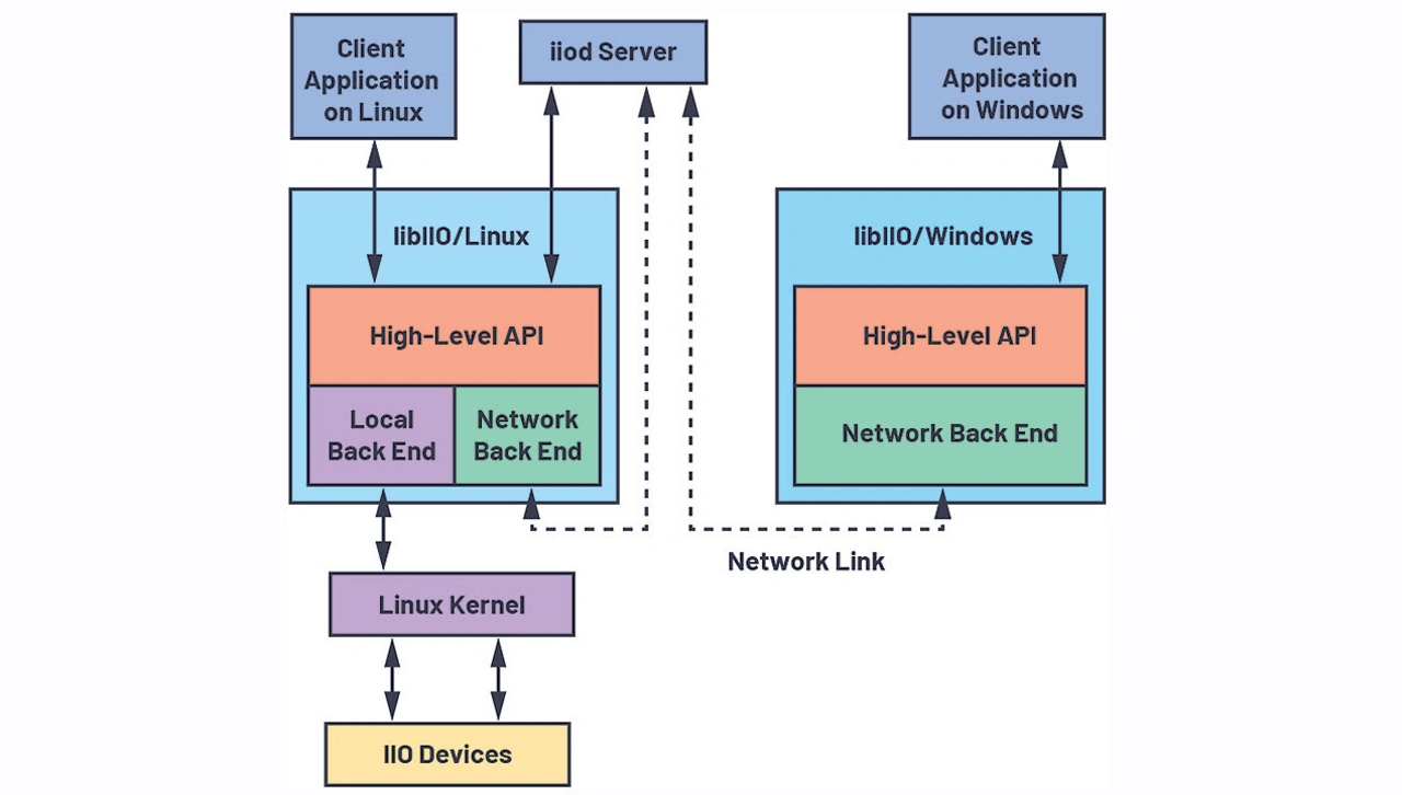 . Links in der Blockschaltung ist das Embedded-System zu sehen, auf dem die libIIO-Bibliothek installiert ist und der iiod-Daemon läuft. Über das Embedded-System können Benutzer auf das lokale Backend und sogar auf das Netzwerk-Backend zugreifen. Im Programmcode können Anwender mit einer einzigen Zeilenänderung zwischen beiden umschalten. Es sind keine weiteren Änderungen am Zielcode erforderlich.