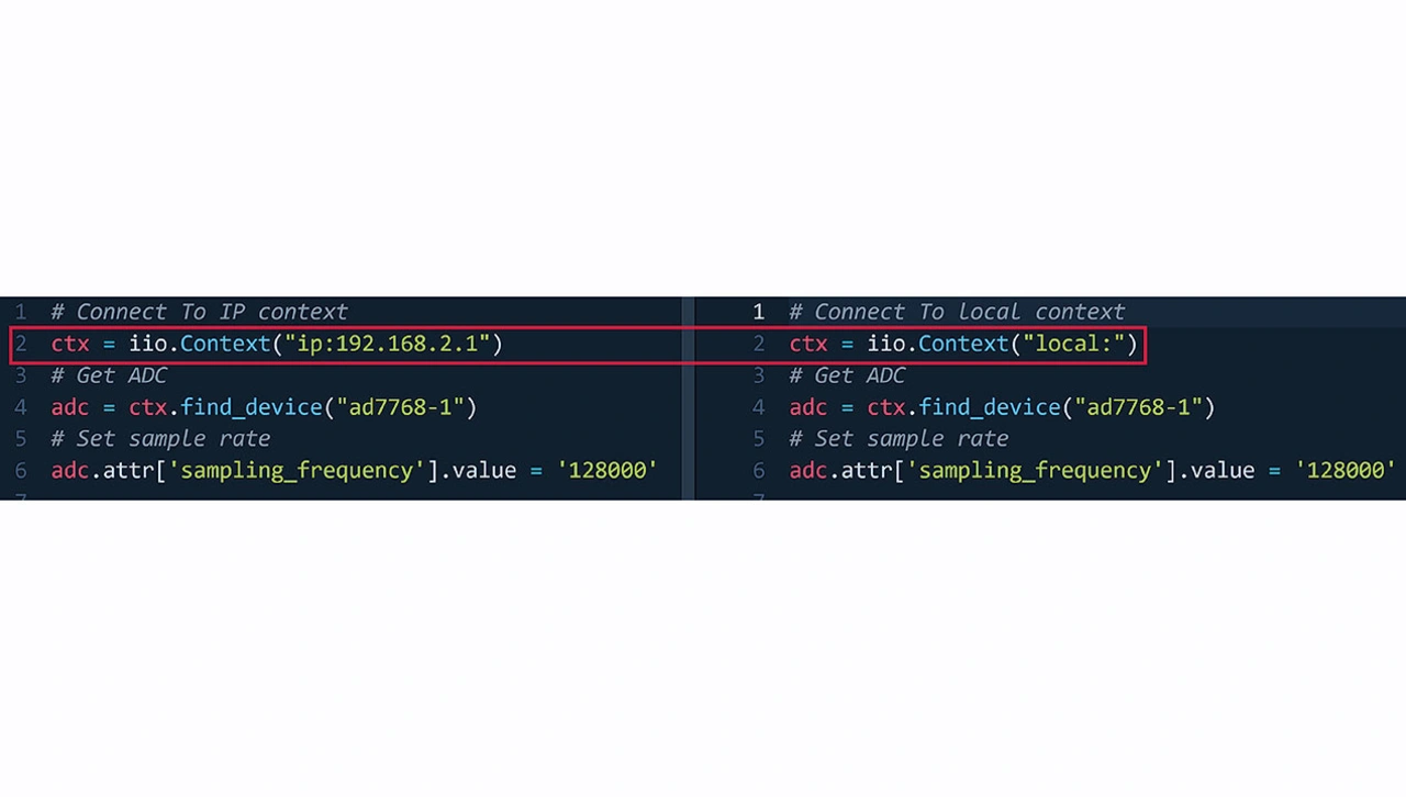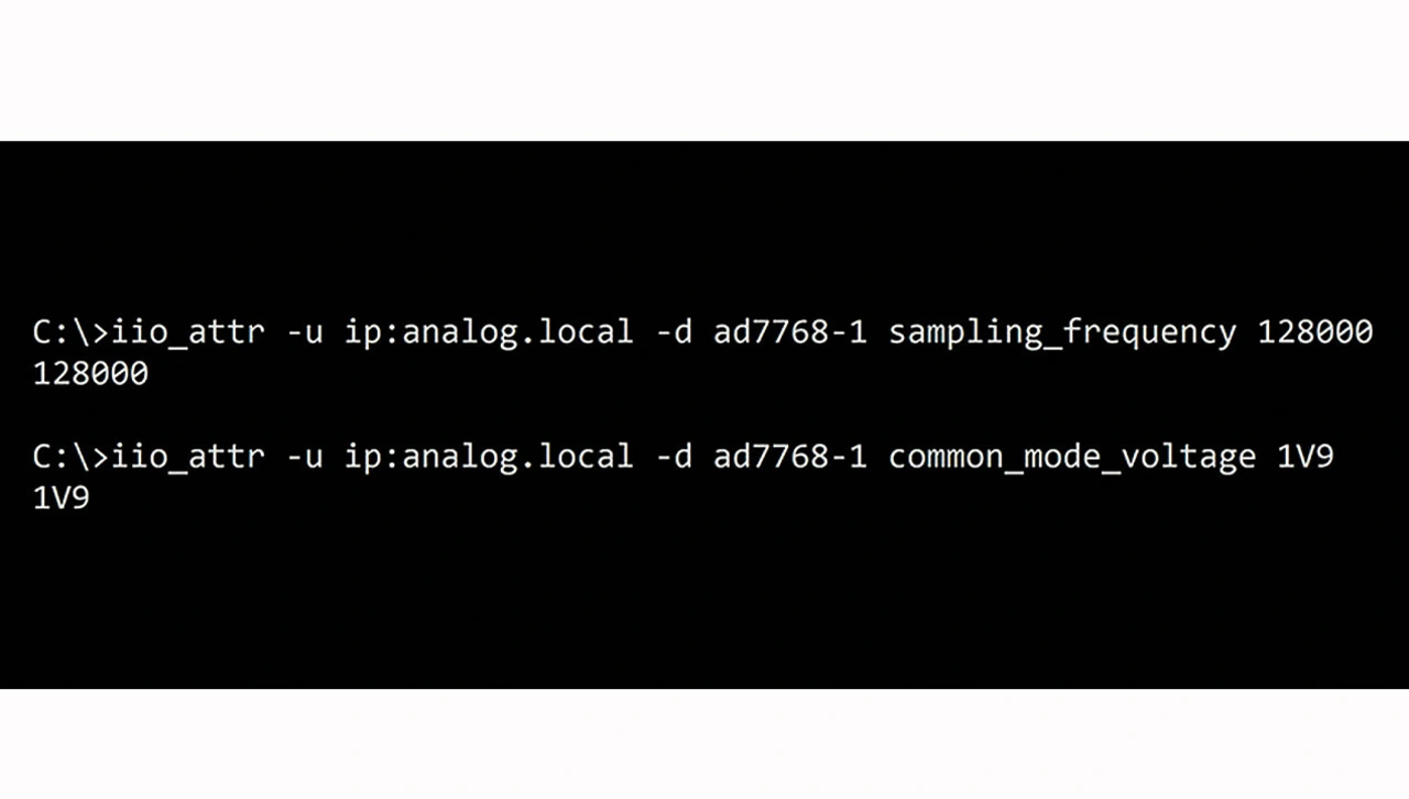 Bild 5 zeigt ein einfaches Beispiel, das lokal oder aus der Ferne ausgeführt werden kann, um die Abtastrate und den Eingangs-Gleichtakt des A/D-Wandlers zu ändern. Das Beispiel verwendet ein IIO-Tool namens iio_attr, mit welchem Benutzer die Gerätekonfigurationen leicht aktualisieren können.