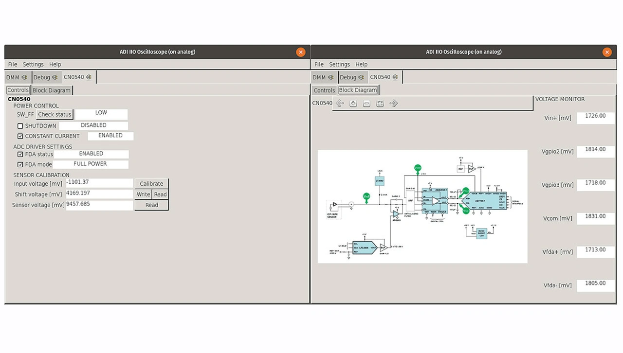 Der gebräuchlichste Einstiegspunkt für Benutzer ist jedoch die GUI-Anwendung IIO-Oscilloscope, die man üblicherweise als OSC bezeichnet. OSC ist genau wie die IIO-Tools zum generischen Gebrauch konzipiert, sodass die Steuerung jedes IIO-Treibers ermöglicht wird. Da OSC auf libIIO basiert, kann es per Fernzugriff oder auf dem Board selbst ausgeführt werden. Es enthält jedoch auch ein Plug-in-System, mit dem spezielle Registerkarten (Tabs) für bestimmte Treiber oder Kombinationen von Treibern hinzugefügt werden können.