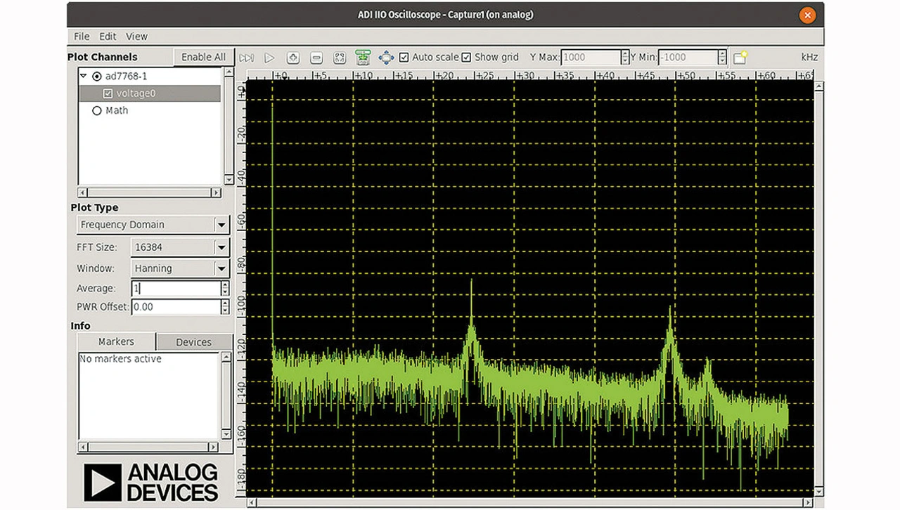 Der letzte wichtige Aspekt von OSC ist das Erfassungsfenster. Dies ermöglicht die Darstellung von Daten, die von ADCs oder beliebigen libIIO-basierten Puffern erfasst wurden. Bild 7 zeigt das Erfassungsfenster im Frequenzbereichsmodus, in welchem die Spektralinformationen der Daten aufgezeichnet werden.