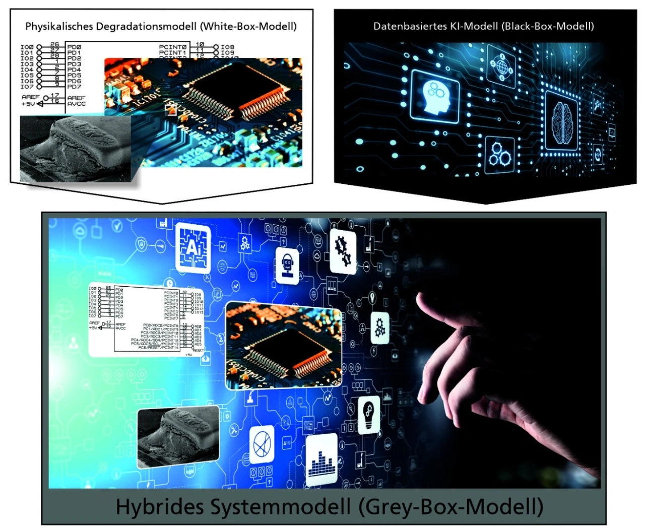 Am Fraunhofer IZM beschäftigt man sich seit vielen Jahren intensiv mit der physikalischen Ebene von elektronischen Systemen. Mit ihrer Expertise im Bereich Konzeption und Messtechnik können die Forschenden Modelle zur Zustandsbestimmung und -vorhersage erstellen, die auf physikalischen Prozessen basieren und beispielsweise Randbedingungen wie Temperatur oder Luftfeuchtigkeit mitmodellieren. Weil die Funktionsweise solcher Modelle gut nachvollziehbar ist, werden sie auch White-Box-Modelle genannt. Je komplexer elektronische Systeme werden, desto schwieriger wird es jedoch, sie rein auf der physikalischen Ebene ganzheitlich zu erfassen und zu überwachen. Für datengetriebene Modelle, die Methoden Künstlicher Intelligenz nutzen, sind komplexe Strukturen und riesige Datenmengen dagegen kein Problem. Was dabei innerhalb des Systems passiert, bleibt jedoch unklar – daher der Name Black-Box-Modell.