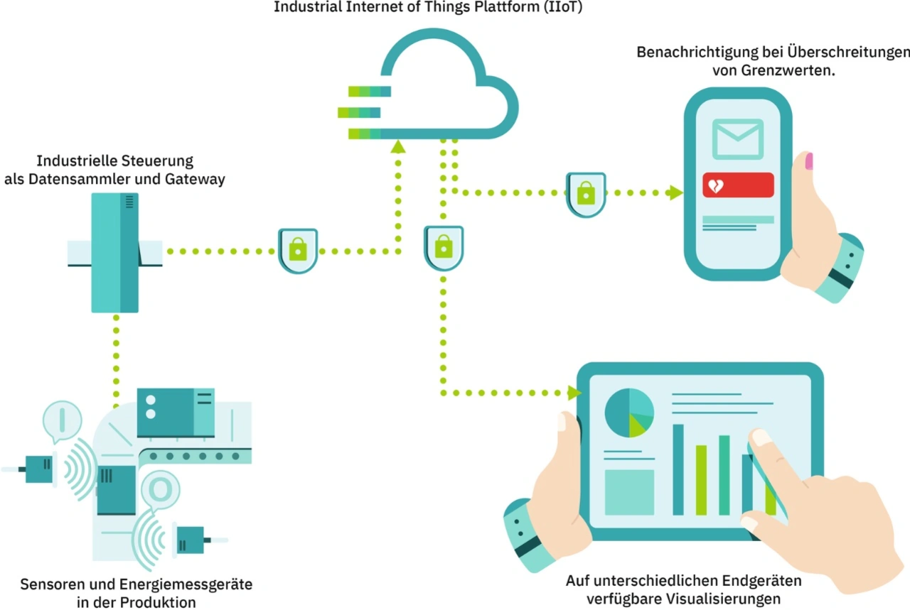 Hersteller Y verwendet ebenfalls die Energie-Daten-Erfassungs-Geräte der Baureihe EMpro. Allerdings verbindet er die Geräte über ein Gateway mit Proficloud.io. Zur Darstellung der Energieströme im Time-Series-Data-Service werden die Geräte auf der IIoT-Plattform registriert, und den Mitarbeitern wird ein individueller Zugriff gewährt. Das Unternehmen hat einen Idealverbrauch definiert und misst mit dem Time-Series-Data-Service die Abweichungen. Bei einer Schwankung von mehr als zehn Prozent bekommen die zuständigen Mitarbeiter eine Information, sodass sie sofort eine Wartung planen oder durchführen können. Auf Basis der verschiedenen Dashboards lassen sich monatliche Berichte über die Wartungsarbeiten oder über Grenzüberschreitungen erstellen. In Zukunft lassen sich die durchgeführten Instandhaltungen als Informationen für andere Unternehmen verwerten, die von den angepassten Wartungszyklen und dem aufgebauten Expertenwissen profitieren können. So senkt Hersteller Y nicht nur Kosten und beeinflusst seine CO2-Bilanz positiv, sondern schafft durch die gesammelten Daten einen Mehrwert für sich und seine Kunden.