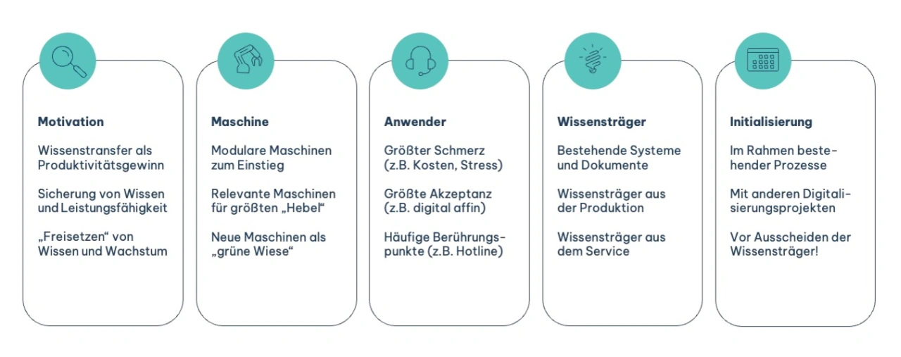 Hierauf haben wir uns deshalb zuerst fokussiert, weil diese »Service-Tätigkeit« wenig standardisiert, sehr komplex und damit am meisten vom Wissen erfahrener Serviceexperten abhängig ist. Gleichzeitig ist sie auch besonders kritisch für die Produktivität, weil sie zu hohen ungeplanten Stillstandskosten führen kann, wenn sie schlecht oder zu langsam ausgeführt ist. Und durch das Ausscheiden der wenigen wissenden Experten passiert genau das: ein ungeahnter Anstieg an Stillständen, Umsatzverlusten und Ausschussraten. Das wollen wir abwenden.