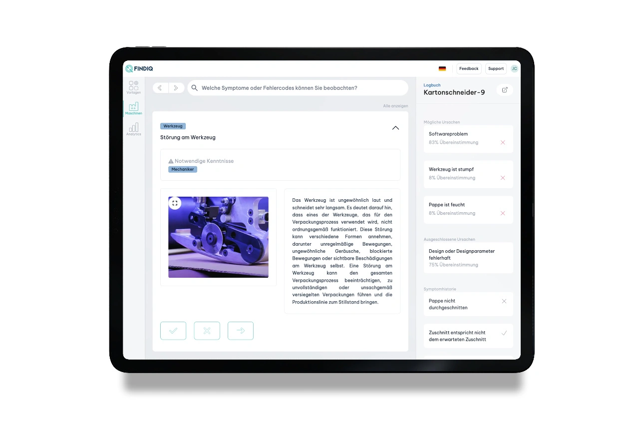 Allein diese beiden Beispiele haben uns gezeigt, dass viele Hypes und Innovationsgelder nicht im Sinne der wirklichen Bedürfnisse der Menschen vor der Maschine ausgefallen sind. Ihnen fehlten keine visuellen Aufbereitungen von Maschinendaten, gar projiziert auf einer Brille. Ihnen fehlten grundlegende Sprach- und Fachkenntnisse zum täglichen Betrieb und schnellen Service der Maschinen. Und weil sich dies mit der zunehmenden Dezentralisierung von Produktion und Service, gepaart mit dem demografischen Wandel und Generationenwechsel in der Industrie, weiter verstärken wird, war der Entschluss gefasst: Wir entwickeln eine Software für den Transfer von Wissen im Maschinenservice, zunächst für die Unterstützung zur schnellen Fehlerdiagnose und -behebung.