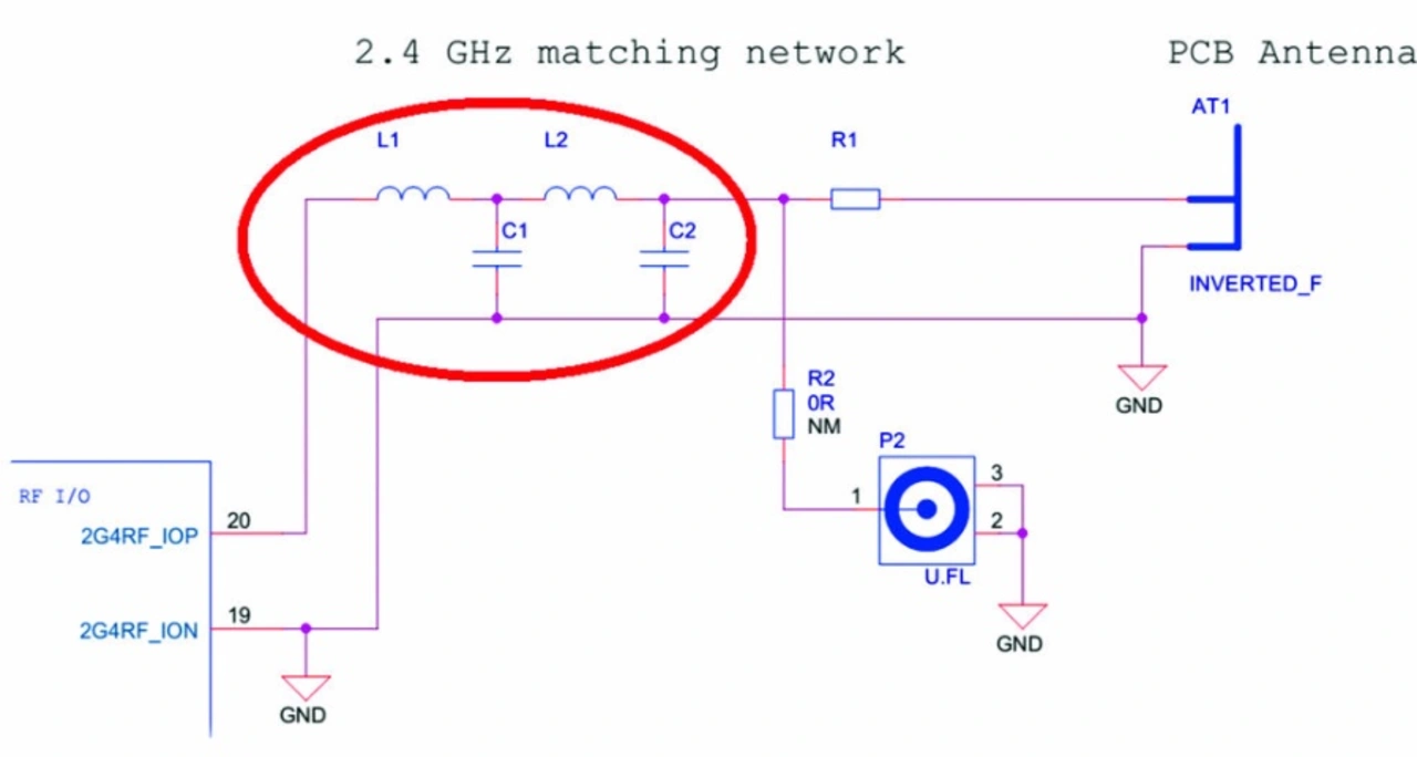 Um diese Filterung besser zu verstehen, sind zuerst die HF-Schaltkreisfunktionen näher zu betrachten. Die Funkeinheit innerhalb des ICs besteht aus einem Sender und Empfänger. Das Ziel des Senders (Tx) ist es, möglichst viel gewünschte Signalanteile in die Antenne einzuspeisen. Die Impedanztransformation zwischen dem HF-IC und der Last zielt darauf ab, die abgestrahlte Leistung bei der Fundamentalfrequenz zu maximieren und jegliche Verluste zur minimieren, die durch Harmonische und andere Störfrequenzen entstehen. Dies erfolgt durch ein kombiniertes Anpassungs- und Filternetzwerk, das aus Serieninduktivitäten und Parallelkondensatoren besteht. Bei einem Sendebetrieb mit 2,4 GHz und Leistungspegeln über 13 dBm wird ein Anpassungsnetzwerk mit vier Elementen empfohlen (Bild 1). Bei dem Betrieb mit niedriger Leistung genügt ein LC-Netzwerk mit zwei Elementen. Im Empfangsmodus verwendet der Empfänger (Rx) das gleiche Impedanzanpassungsnetzwerk, um maximale Empfindlichkeit zu erzielen.
